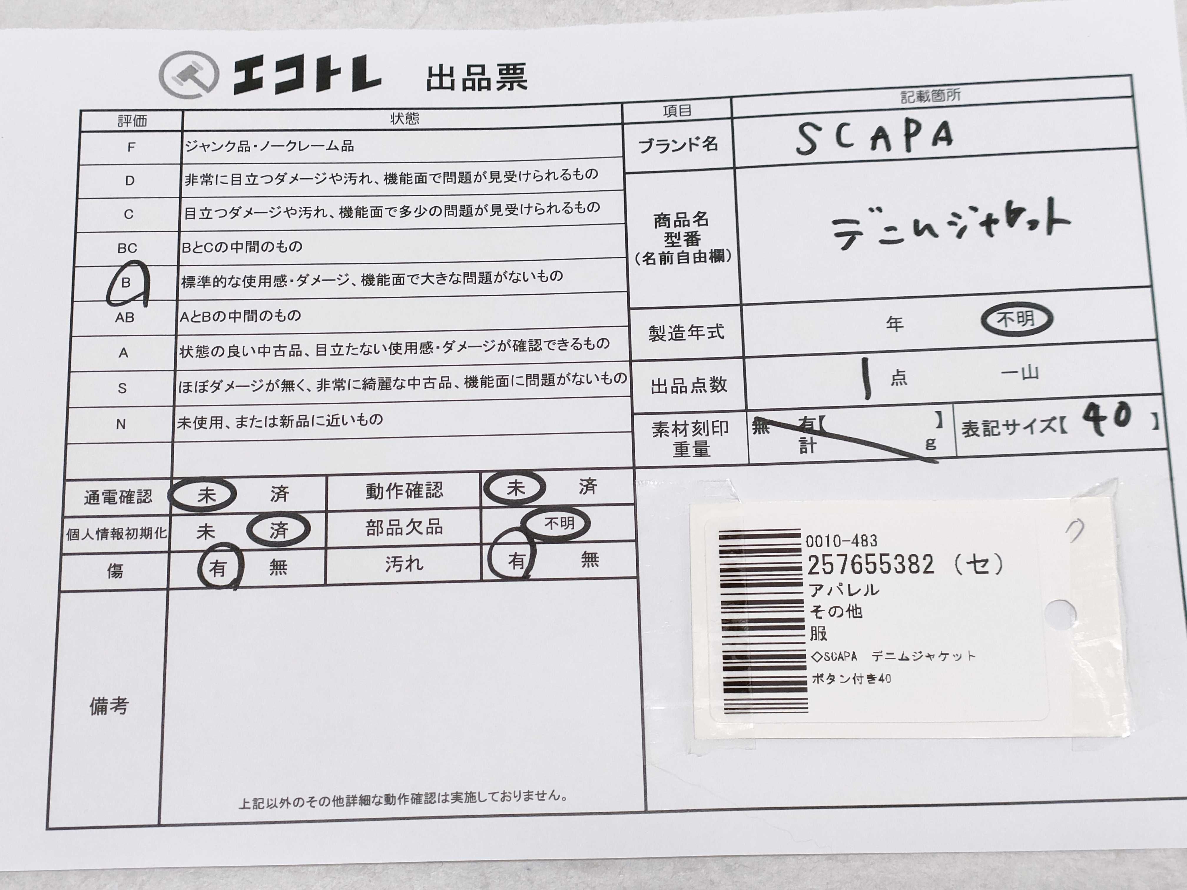 商品内容によって、JITBOXなどでの発送となる可能性がございます事ご理解下さい。年式などの商品情報詳細は写真にてご確認願います。※ご入札の際はご利用規約をよくお読みになってからのご参加お願いします。","タイプライン":"","カテゴリ":"アパレル","形状コード":"ジャケット","付属品コード":"","シリアル・シール・型番":"40"