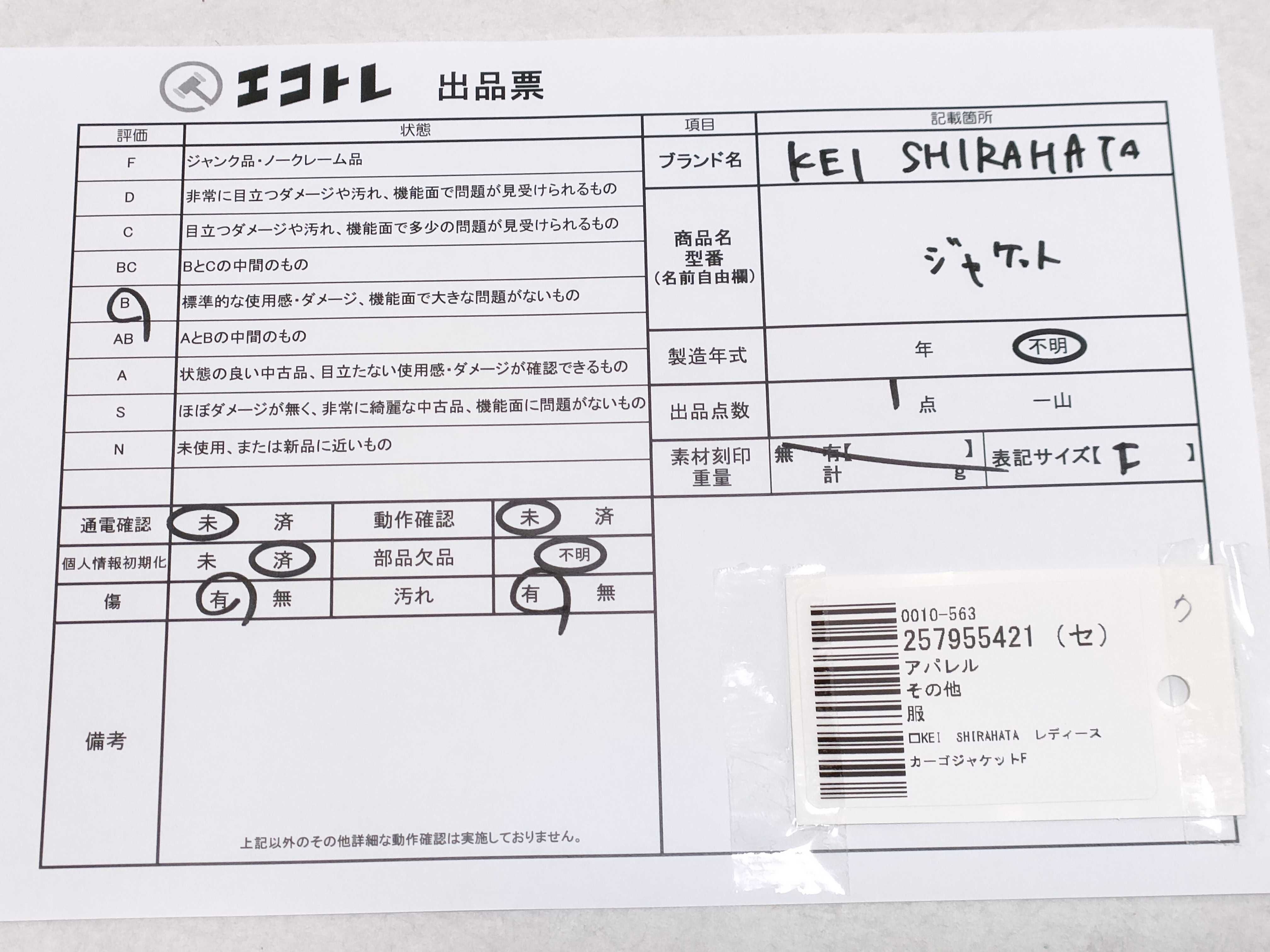 商品内容によって、JITBOXなどでの発送となる可能性がございます事ご理解下さい。年式などの商品情報詳細は写真にてご確認願います。※ご入札の際はご利用規約をよくお読みになってからのご参加お願いします。","タイプライン":"","カテゴリ":"アパレル","形状コード":"ジャケット","付属品コード":"","シリアル・シール・型番":"F"