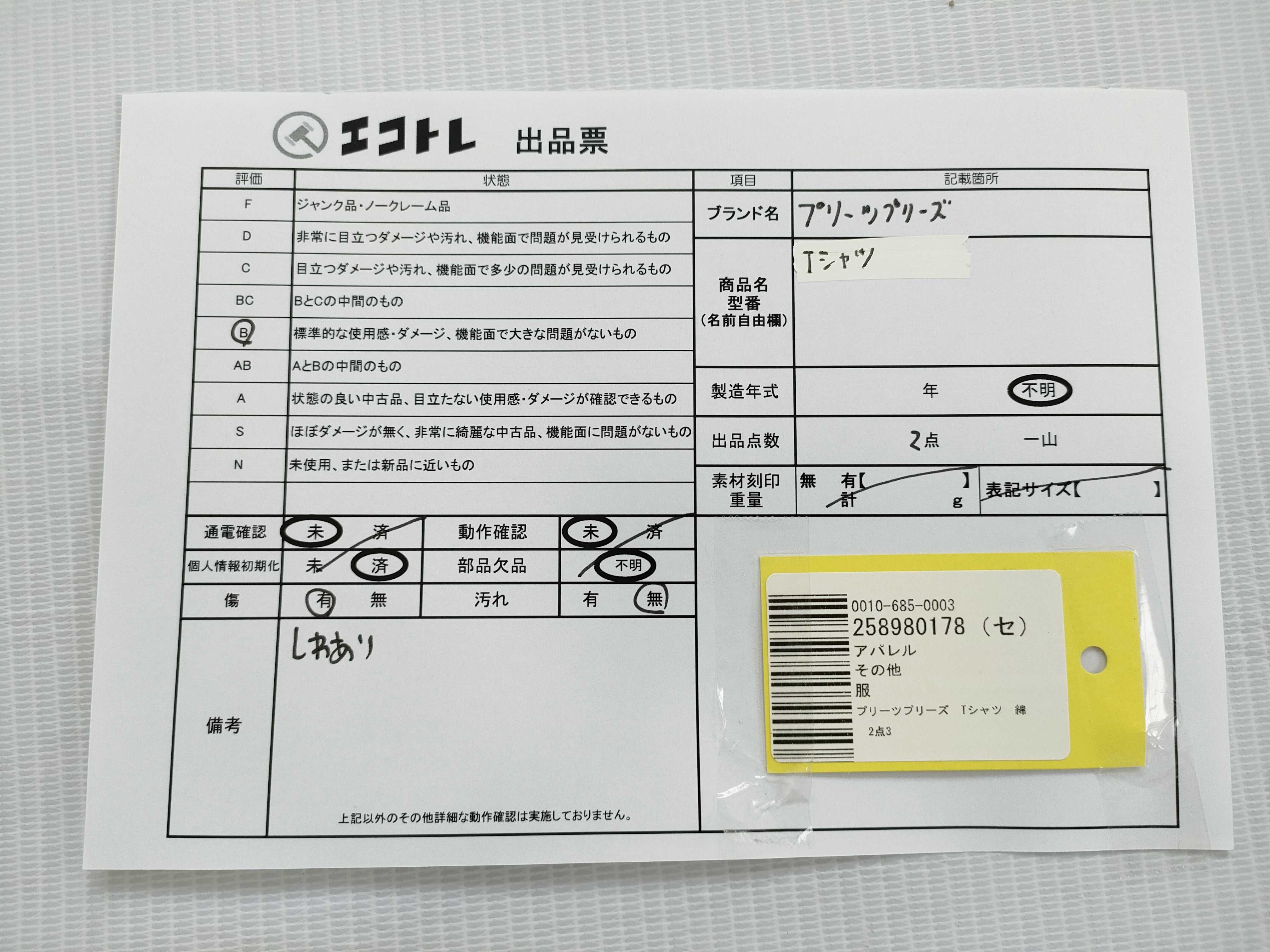 商品内容によって、JITBOXなどでの発送となる可能性がございます事ご理解下さい。年式などの商品情報詳細は写真にてご確認願います。※ご入札の際はご利用規約をよくお読みになってからのご参加お願いします。","タイプライン":"","カテゴリ":"アパレル","形状コード":"Tシャツ","付属品コード":"","シリアル・シール・型番":"3"