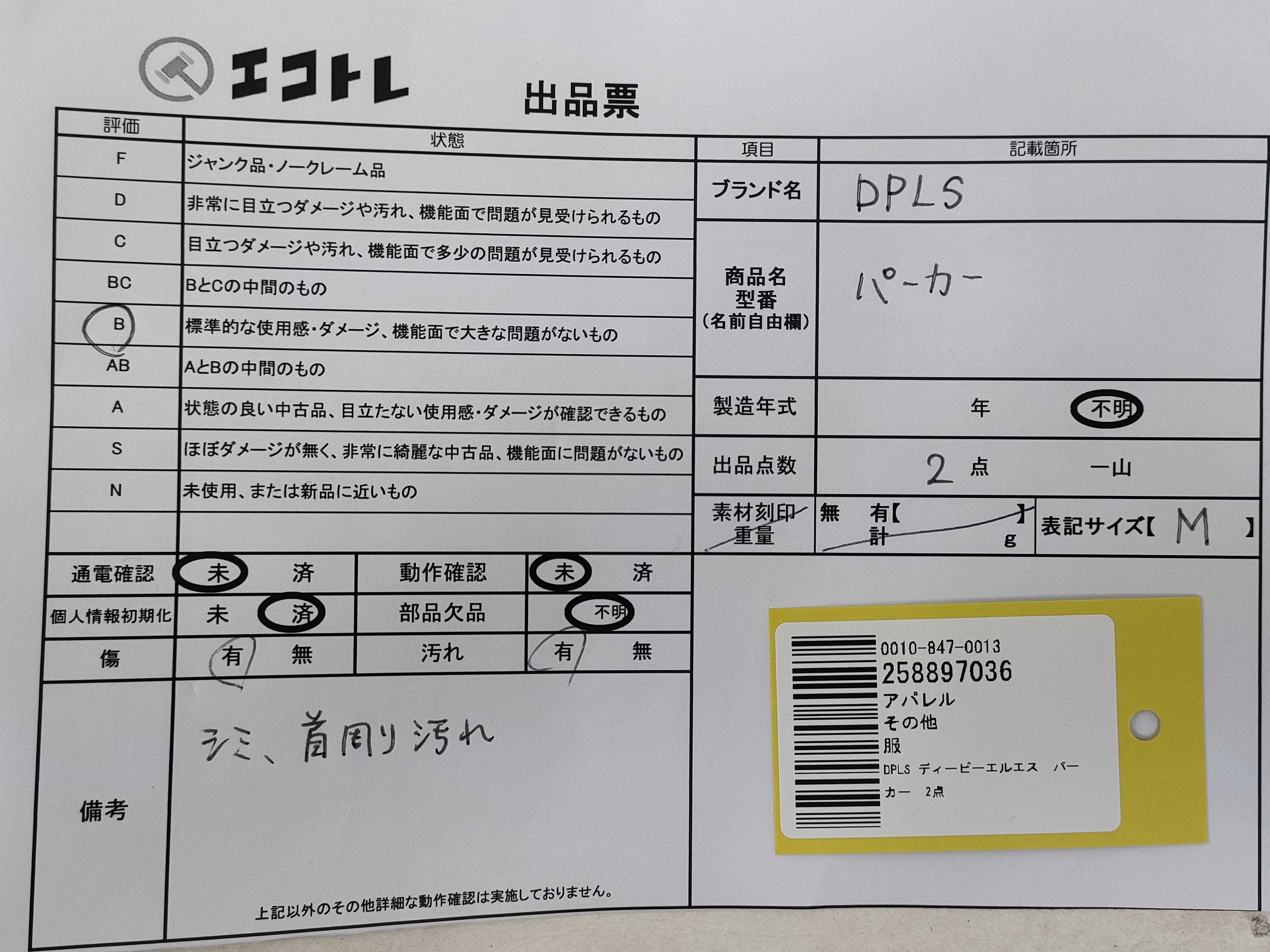 商品内容によって、JITBOXなどでの発送となる可能性がございます事ご理解下さい。年式などの商品情報詳細は写真にてご確認願います。※ご入札の際はご利用規約をよくお読みになってからのご参加お願いします。","タイプライン":"","カテゴリ":"アパレル","形状コード":"トップス","付属品コード":"","シリアル・シール・型番":""
