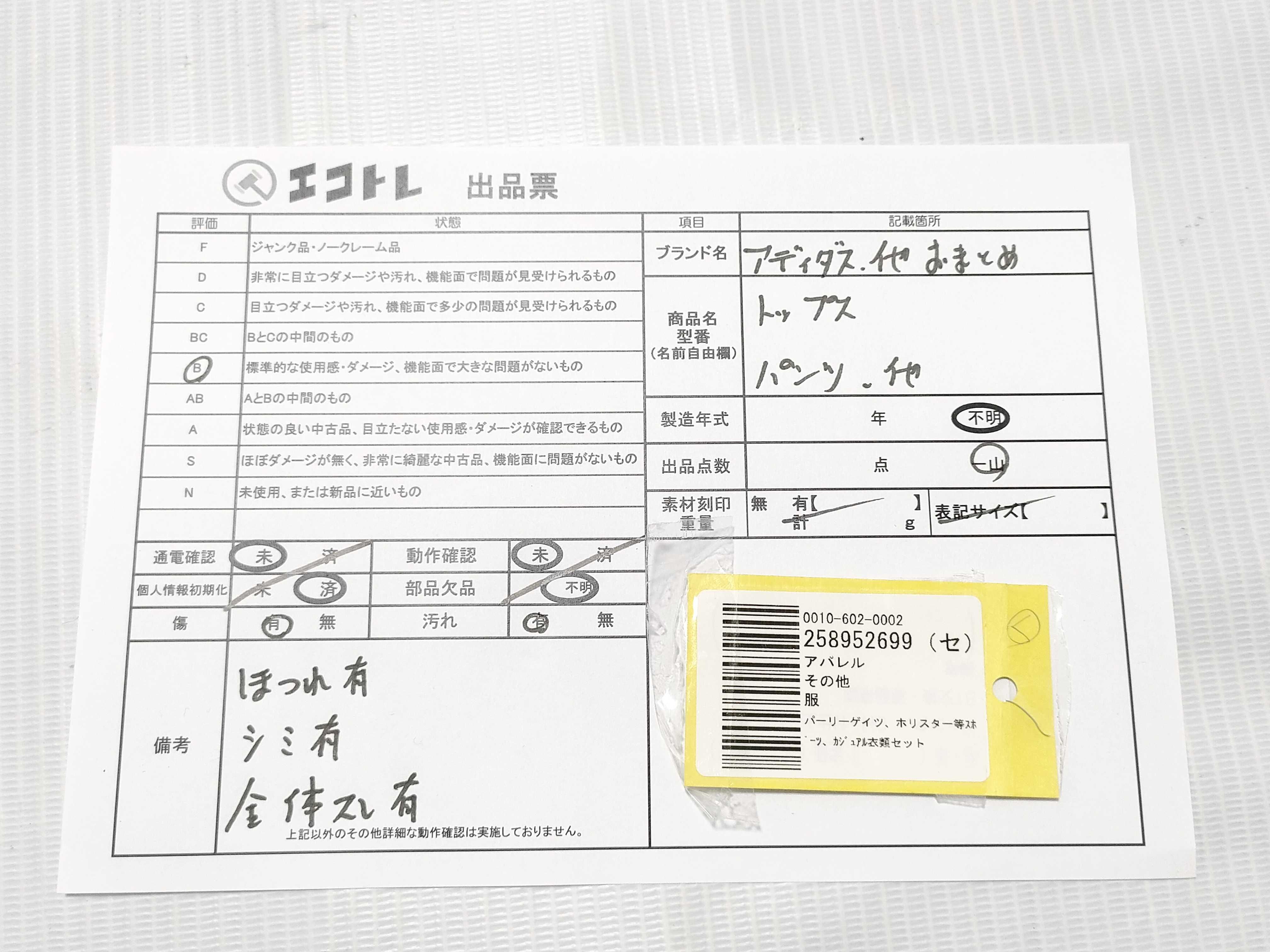 商品内容によって、JITBOXなどでの発送となる可能性がございます事ご理解下さい。年式などの商品情報詳細は写真にてご確認願います。※ご入札の際はご利用規約をよくお読みになってからのご参加お願いします。","タイプライン":"","カテゴリ":"アパレル","形状コード":"トップス","付属品コード":"","シリアル・シール・型番":""