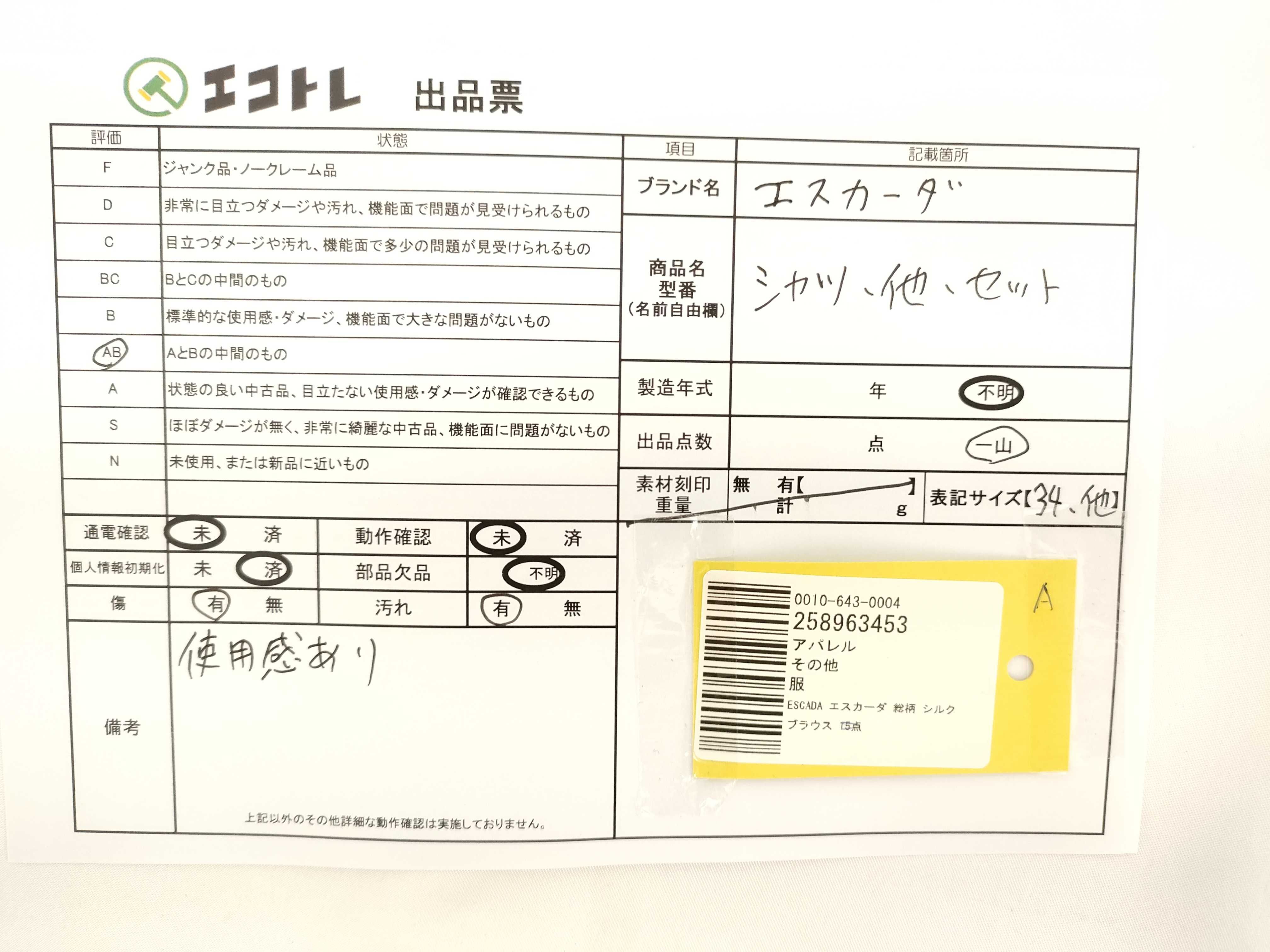 商品内容によって、JITBOXなどでの発送となる可能性がございます事ご理解下さい。年式などの商品情報詳細は写真にてご確認願います。※ご入札の際はご利用規約をよくお読みになってからのご参加お願いします。","タイプライン":"","カテゴリ":"アパレル","形状コード":"シャツ","付属品コード":"","シリアル・シール・型番":""