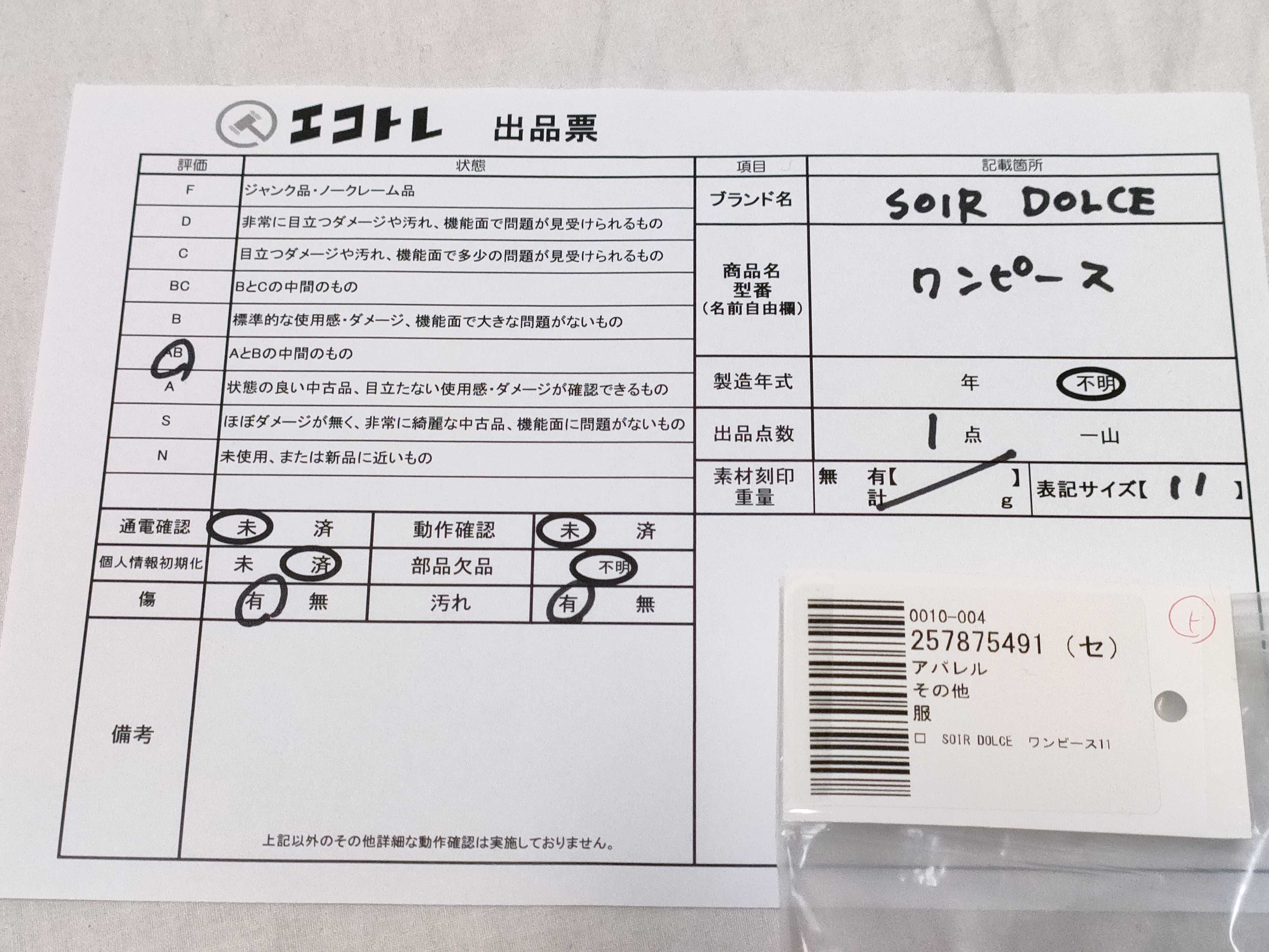 商品内容によって、JITBOXなどでの発送となる可能性がございます事ご理解下さい。年式などの商品情報詳細は写真にてご確認願います。※ご入札の際はご利用規約をよくお読みになってからのご参加お願いします。","タイプライン":"","カテゴリ":"アパレル","形状コード":"ワンピース","付属品コード":"","シリアル・シール・型番":"11"