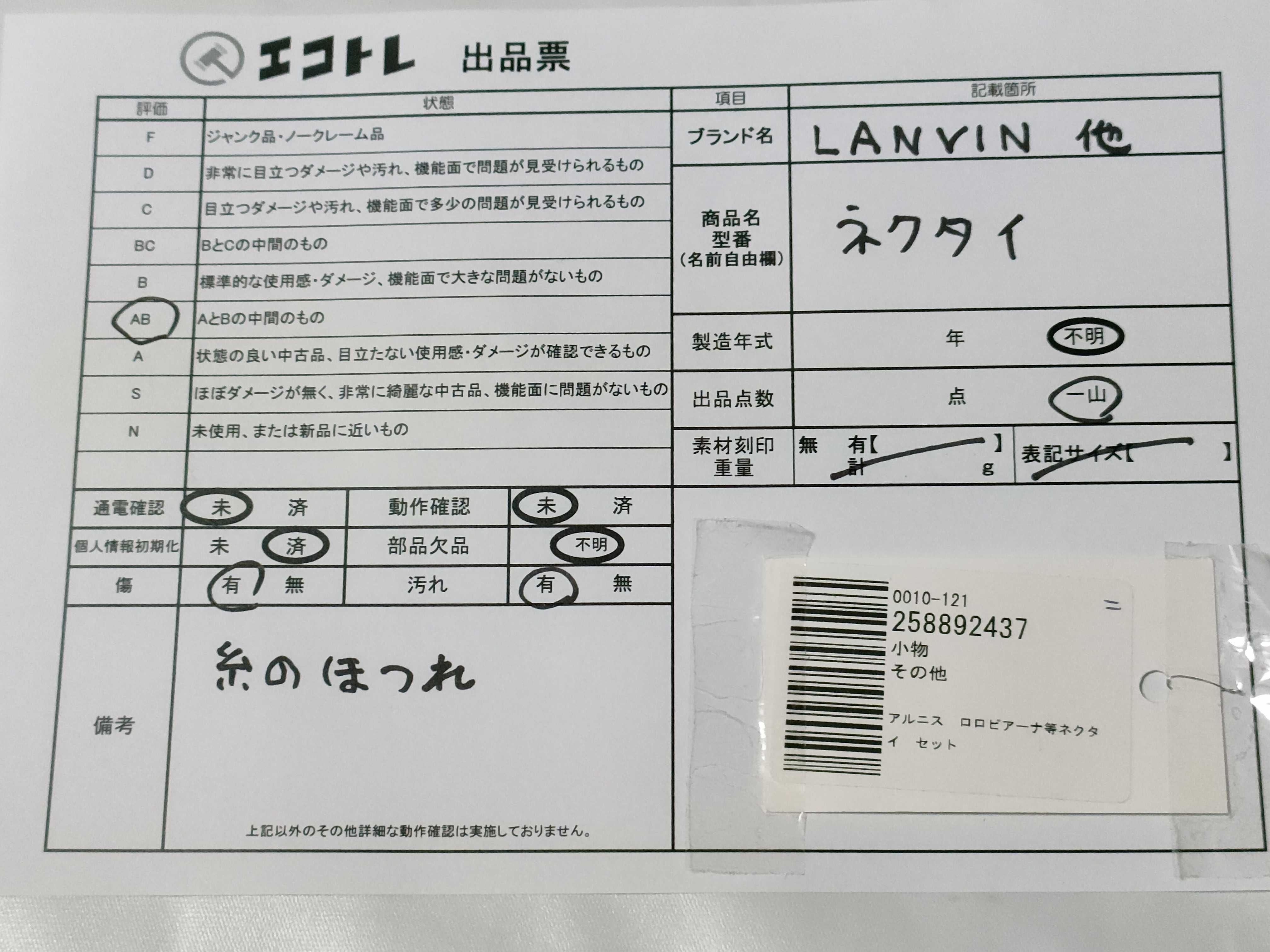 商品内容によって、JITBOXなどでの発送となる可能性がございます事ご理解下さい。年式などの商品情報詳細は写真にてご確認願います。※ご入札の際はご利用規約をよくお読みになってからのご参加お願いします。","タイプライン":"","カテゴリ":"アパレル","形状コード":"ネクタイ","付属品コード":"","シリアル・シール・型番":""