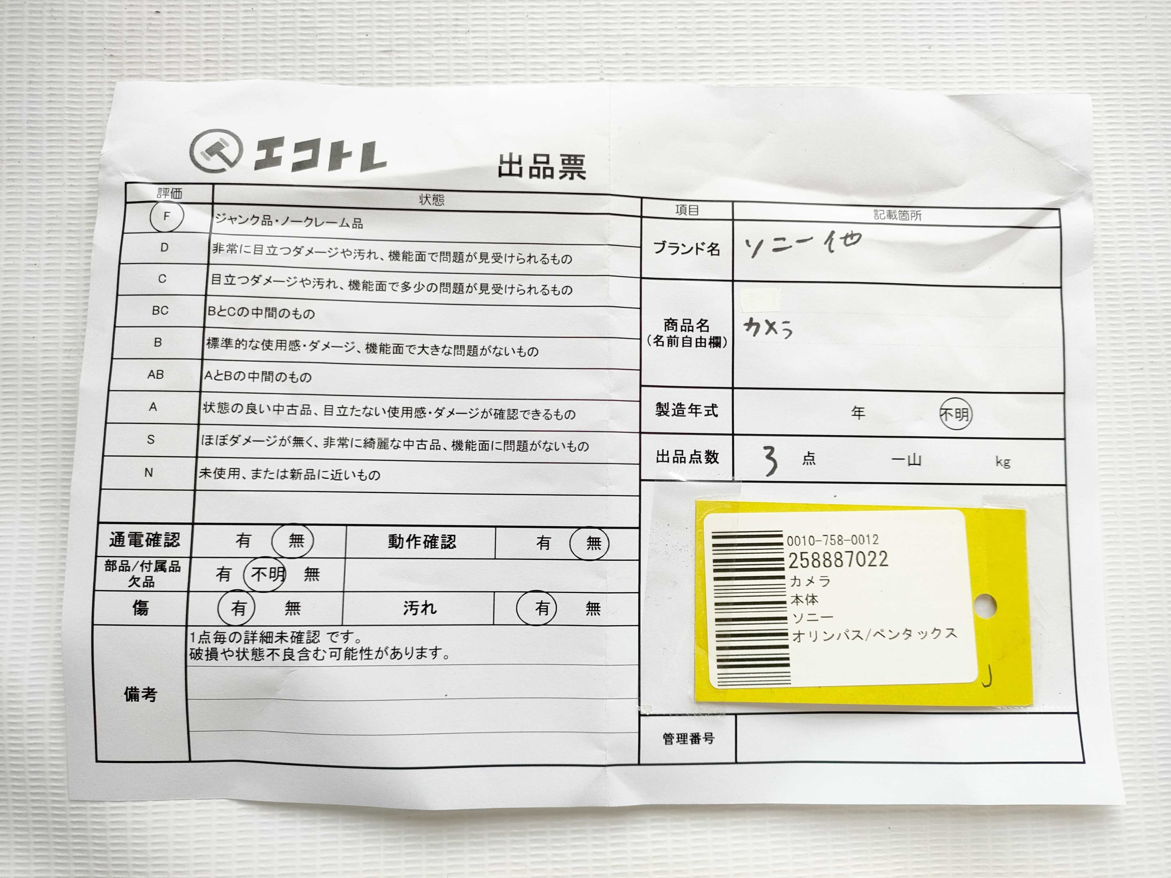 商品内容によって、JITBOXなどでの発送となる可能性がございます事ご理解下さい。年式などの商品情報詳細は写真にてご確認願います。※ご入札の際はご利用規約をよくお読みになってからのご参加お願いします。","タイプライン":"","カテゴリ":"カメラ","形状コード":"カメラ","付属品コード":"","シリアル・シール・型番":""