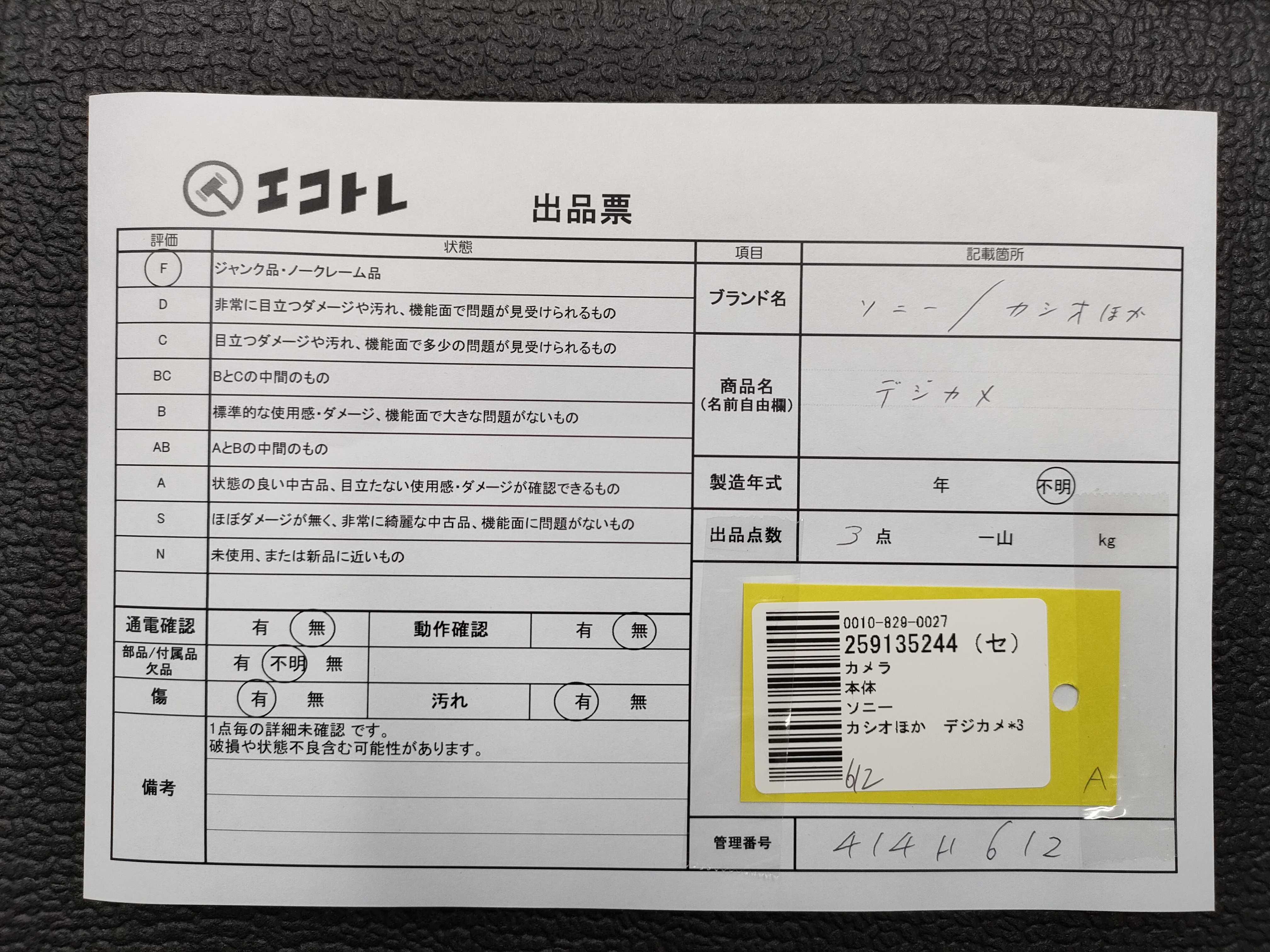 商品内容によって、JITBOXなどでの発送となる可能性がございます事ご理解下さい。年式などの商品情報詳細は写真にてご確認願います。※ご入札の際はご利用規約をよくお読みになってからのご参加お願いします。","タイプライン":"","カテゴリ":"カメラ","形状コード":"カメラ","付属品コード":"","シリアル・シール・型番":""