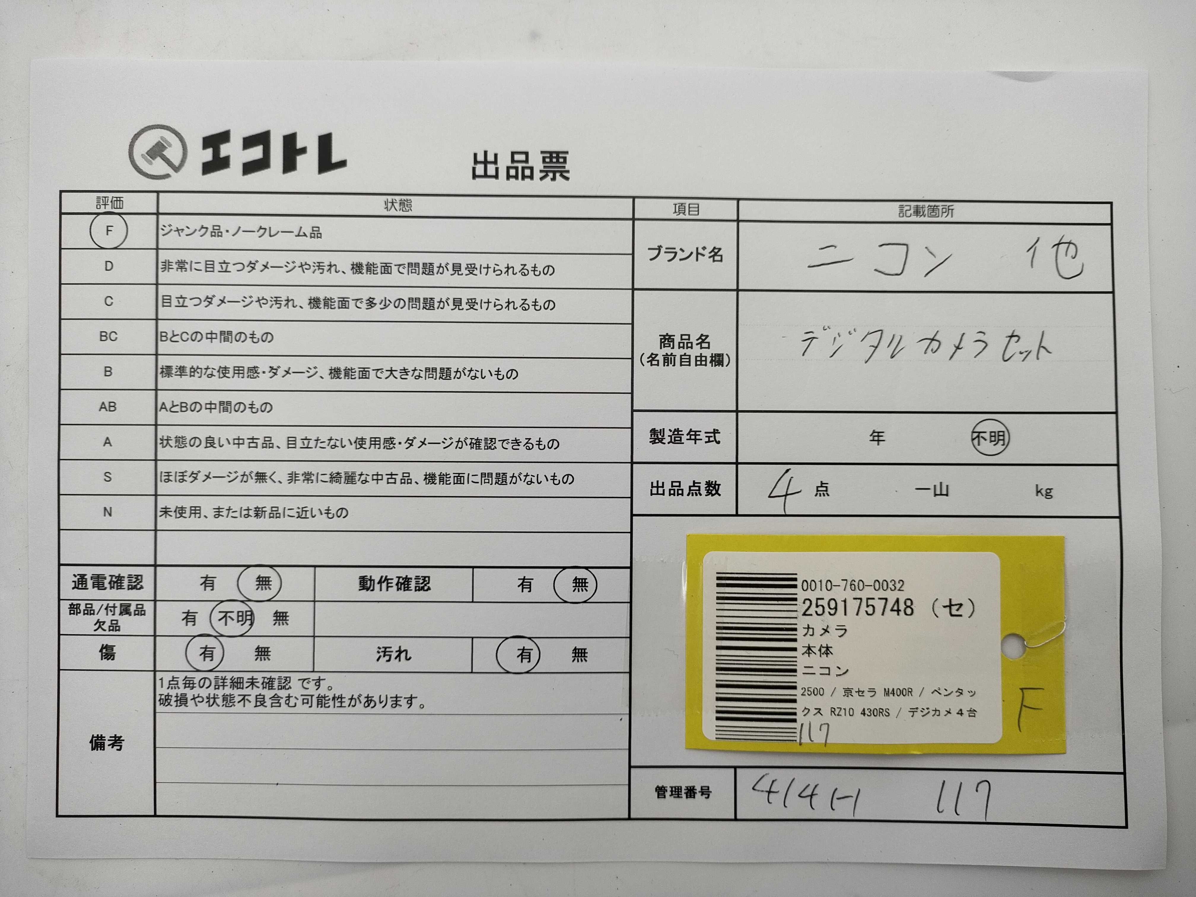 商品内容によって、JITBOXなどでの発送となる可能性がございます事ご理解下さい。年式などの商品情報詳細は写真にてご確認願います。※ご入札の際はご利用規約をよくお読みになってからのご参加お願いします。","タイプライン":"","カテゴリ":"カメラ","形状コード":"カメラ","付属品コード":"","シリアル・シール・型番":""