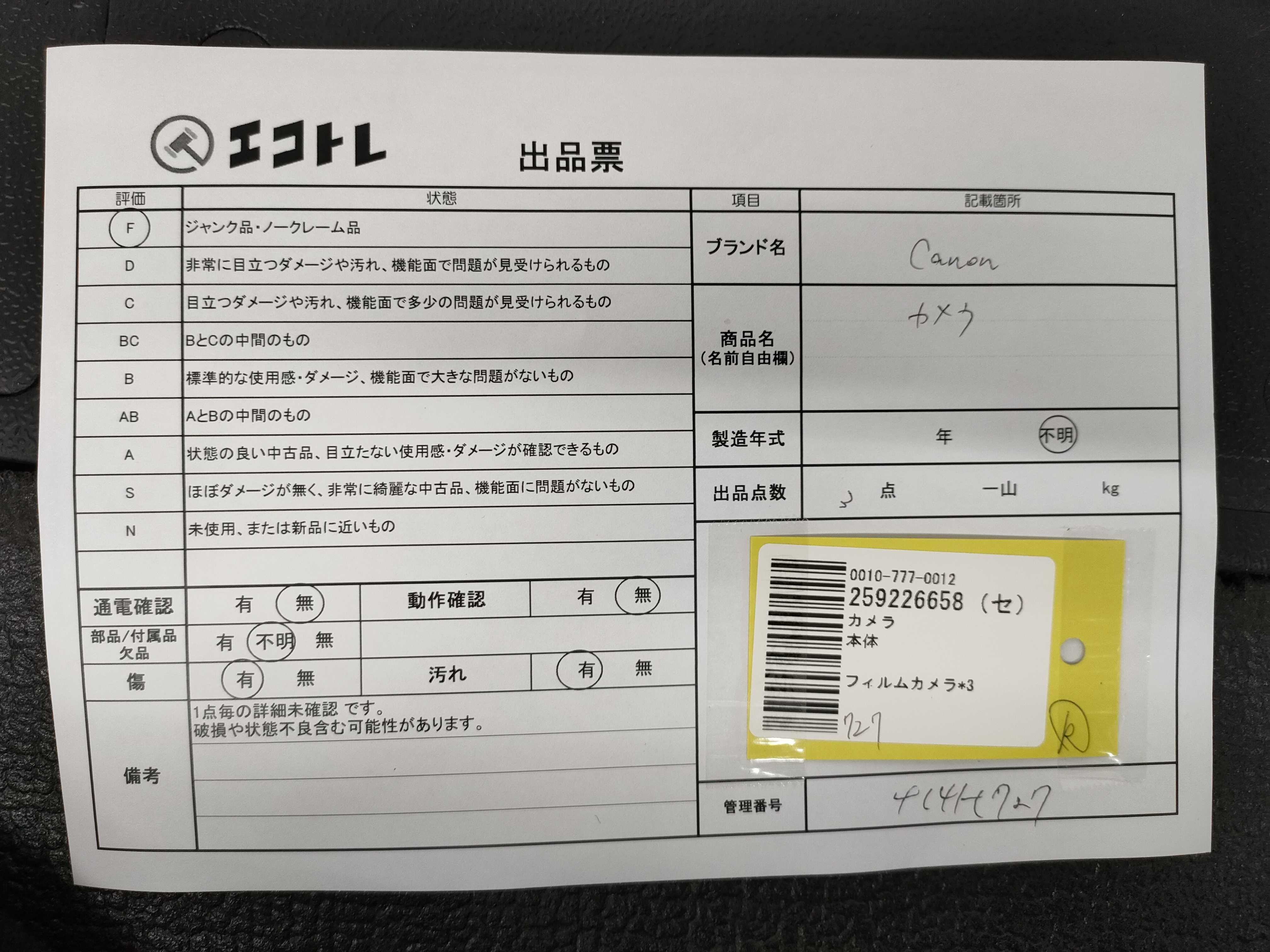 商品内容によって、JITBOXなどでの発送となる可能性がございます事ご理解下さい。年式などの商品情報詳細は写真にてご確認願います。※ご入札の際はご利用規約をよくお読みになってからのご参加お願いします。","タイプライン":"","カテゴリ":"カメラ","形状コード":"カメラ","付属品コード":"","シリアル・シール・型番":""