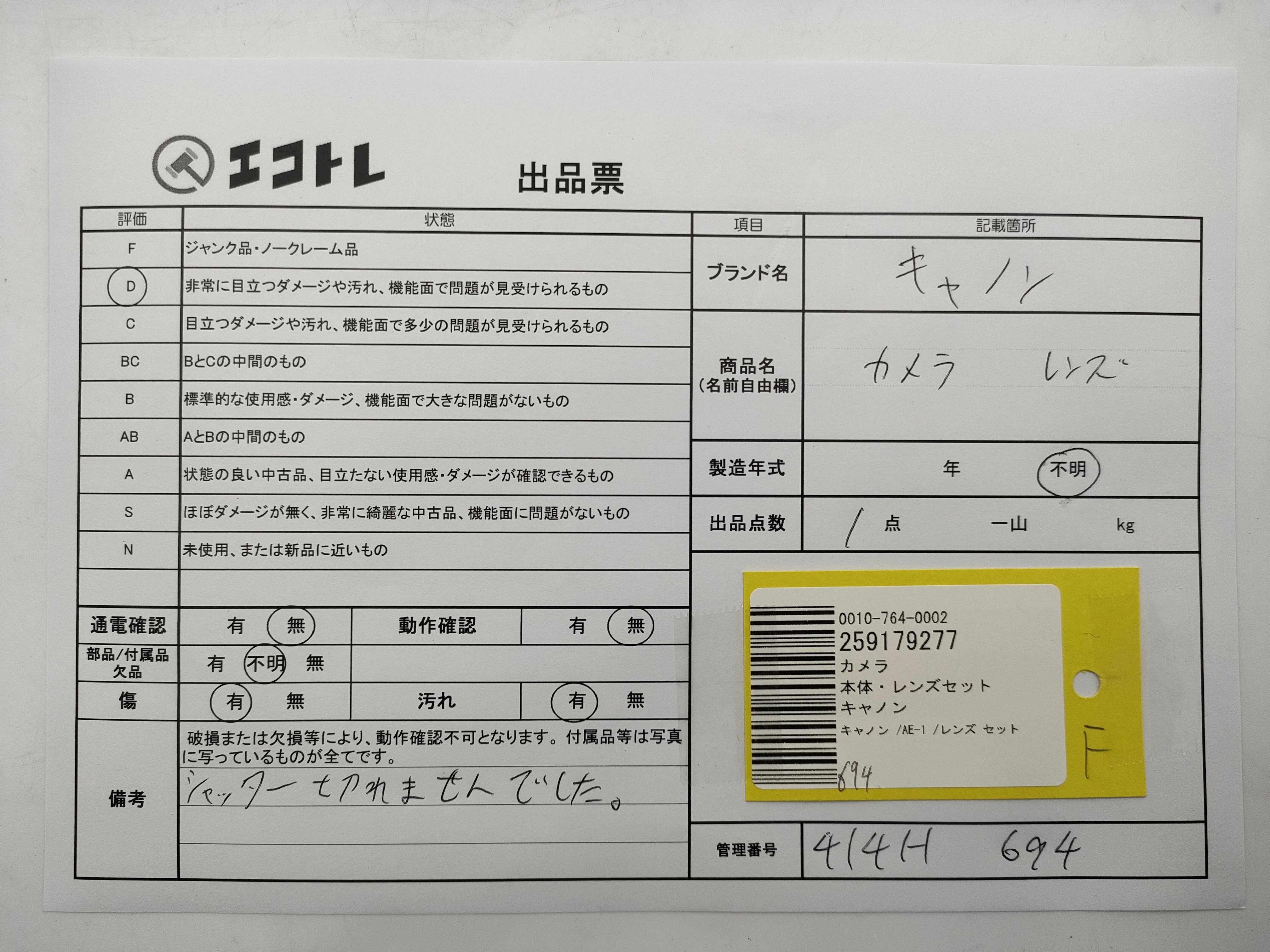 商品内容によって、JITBOXなどでの発送となる可能性がございます事ご理解下さい。年式などの商品情報詳細は写真にてご確認願います。※ご入札の際はご利用規約をよくお読みになってからのご参加お願いします。","タイプライン":"","カテゴリ":"カメラ","形状コード":"カメラ","付属品コード":"","シリアル・シール・型番":""