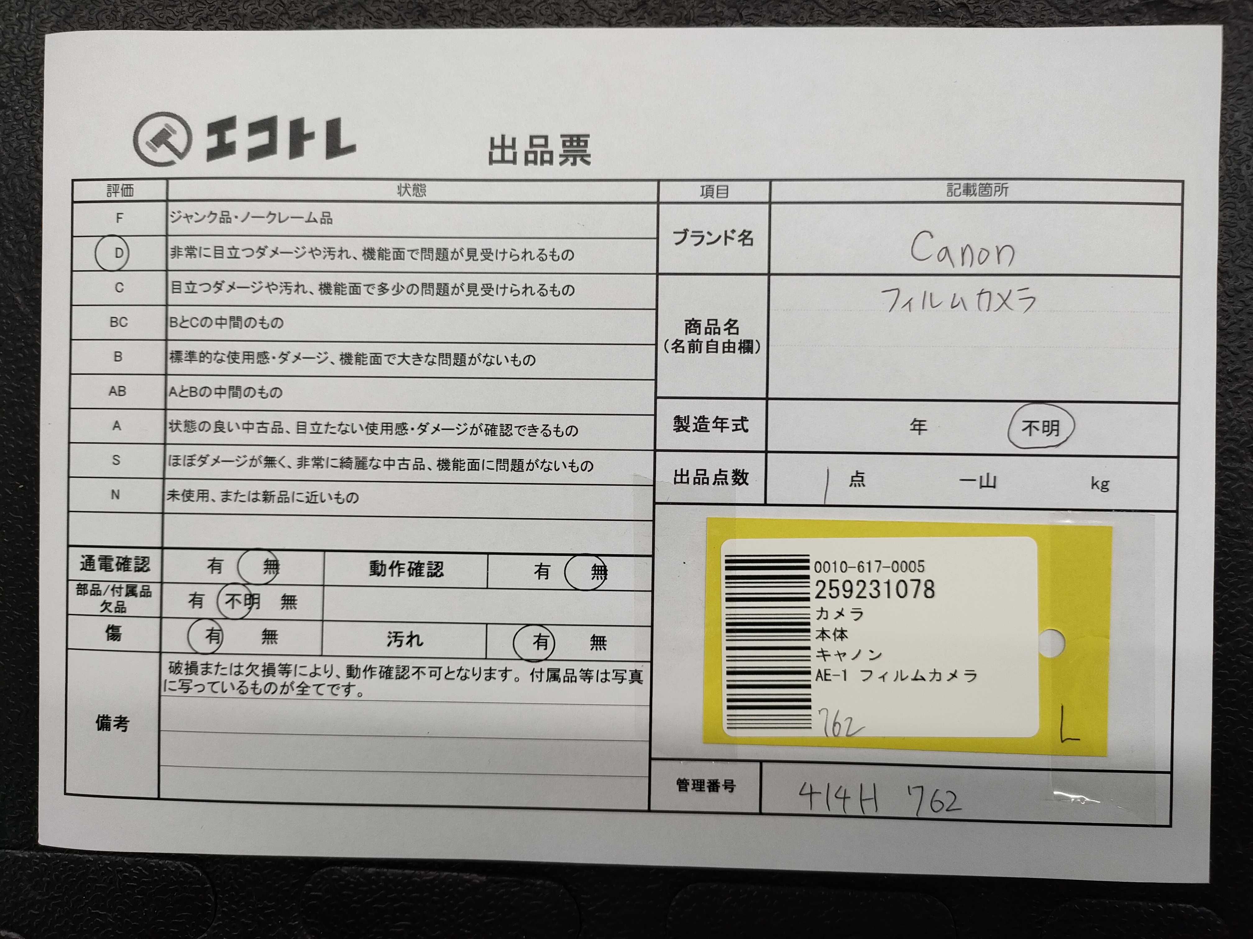 商品内容によって、JITBOXなどでの発送となる可能性がございます事ご理解下さい。年式などの商品情報詳細は写真にてご確認願います。※ご入札の際はご利用規約をよくお読みになってからのご参加お願いします。","タイプライン":"","カテゴリ":"カメラ","形状コード":"カメラ","付属品コード":"","シリアル・シール・型番":""