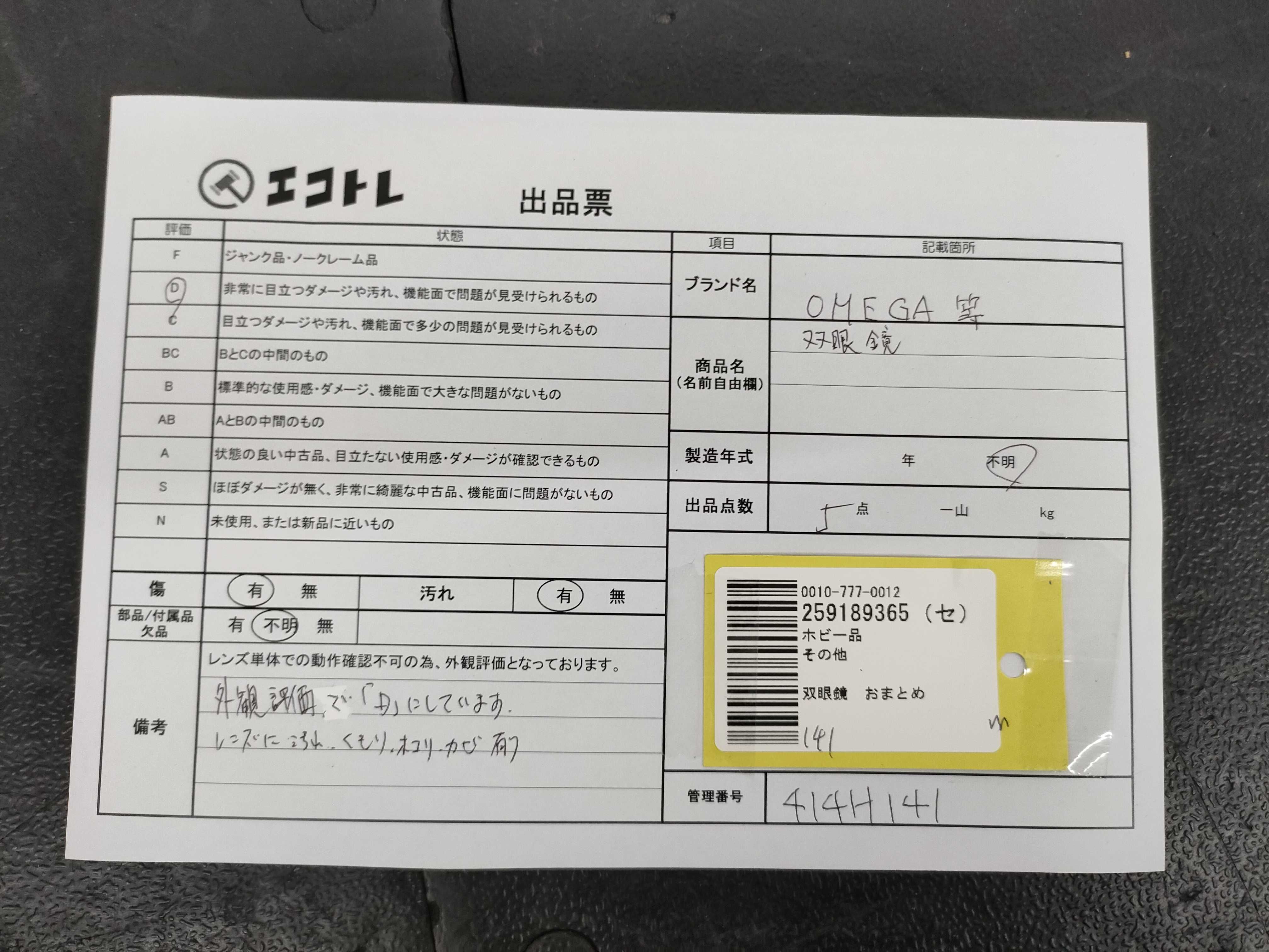 商品内容によって、JITBOXなどでの発送となる可能性がございます事ご理解下さい。年式などの商品情報詳細は写真にてご確認願います。※ご入札の際はご利用規約をよくお読みになってからのご参加お願いします。","タイプライン":"","カテゴリ":"カメラ","形状コード":"双眼鏡","付属品コード":"","シリアル・シール・型番":""