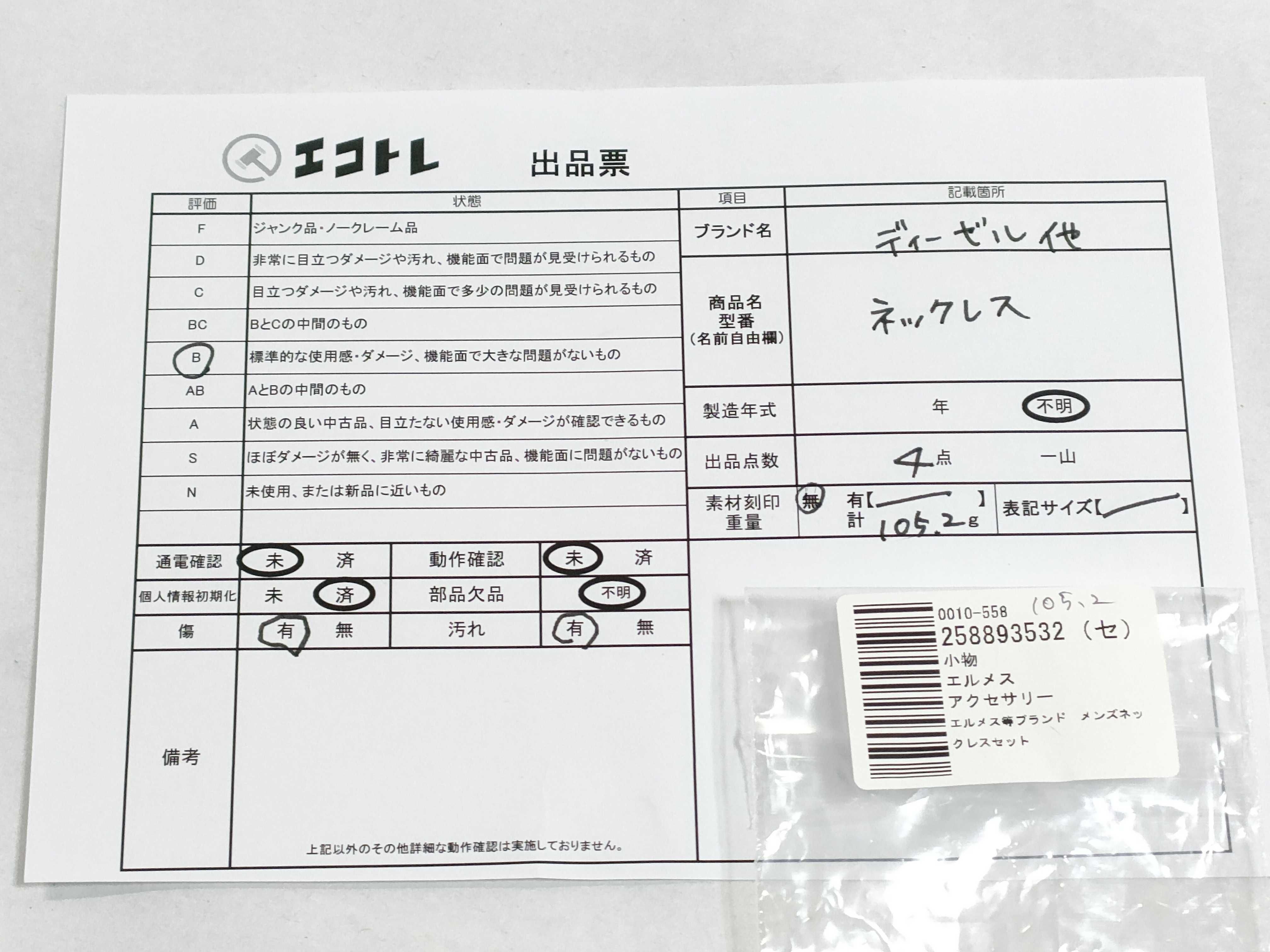 商品内容によって、JITBOXなどでの発送となる可能性がございます事ご理解下さい。年式などの商品情報詳細は写真にてご確認願います。※ご入札の際はご利用規約をよくお読みになってからのご参加お願いします。","タイプライン":"","カテゴリ":"アクセサリー","形状コード":"ネックレス","付属品コード":"","シリアル・シール・型番":""