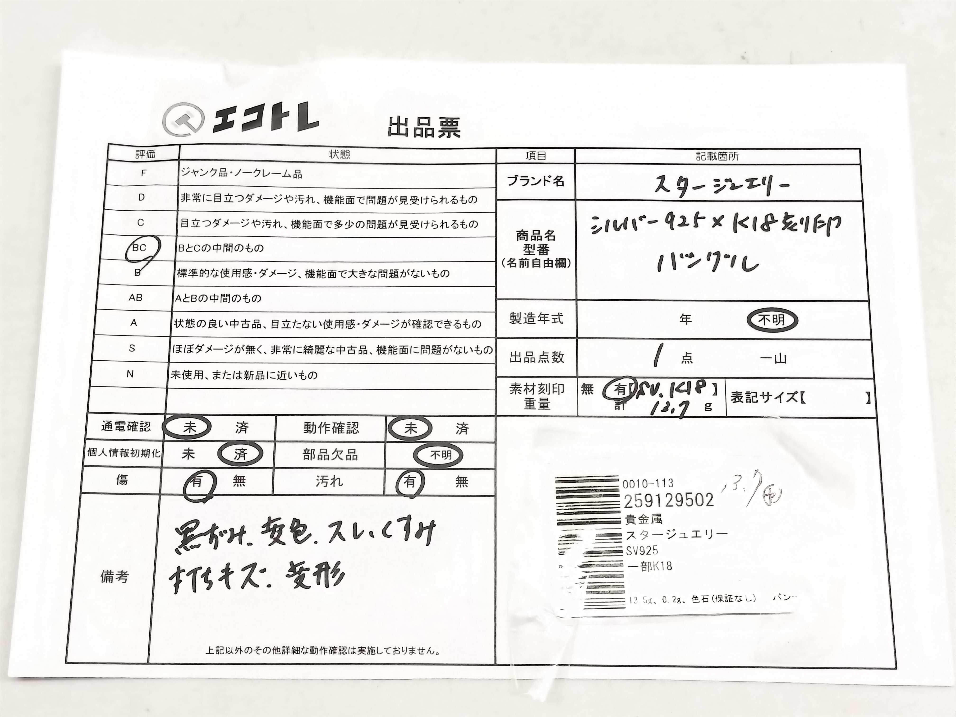 商品内容によって、JITBOXなどでの発送となる可能性がございます事ご理解下さい。年式などの商品情報詳細は写真にてご確認願います。※ご入札の際はご利用規約をよくお読みになってからのご参加お願いします。","タイプライン":"","カテゴリ":"アクセサリー","形状コード":"ブレスレット・バングル","付属品コード":"","シリアル・シール・型番":""