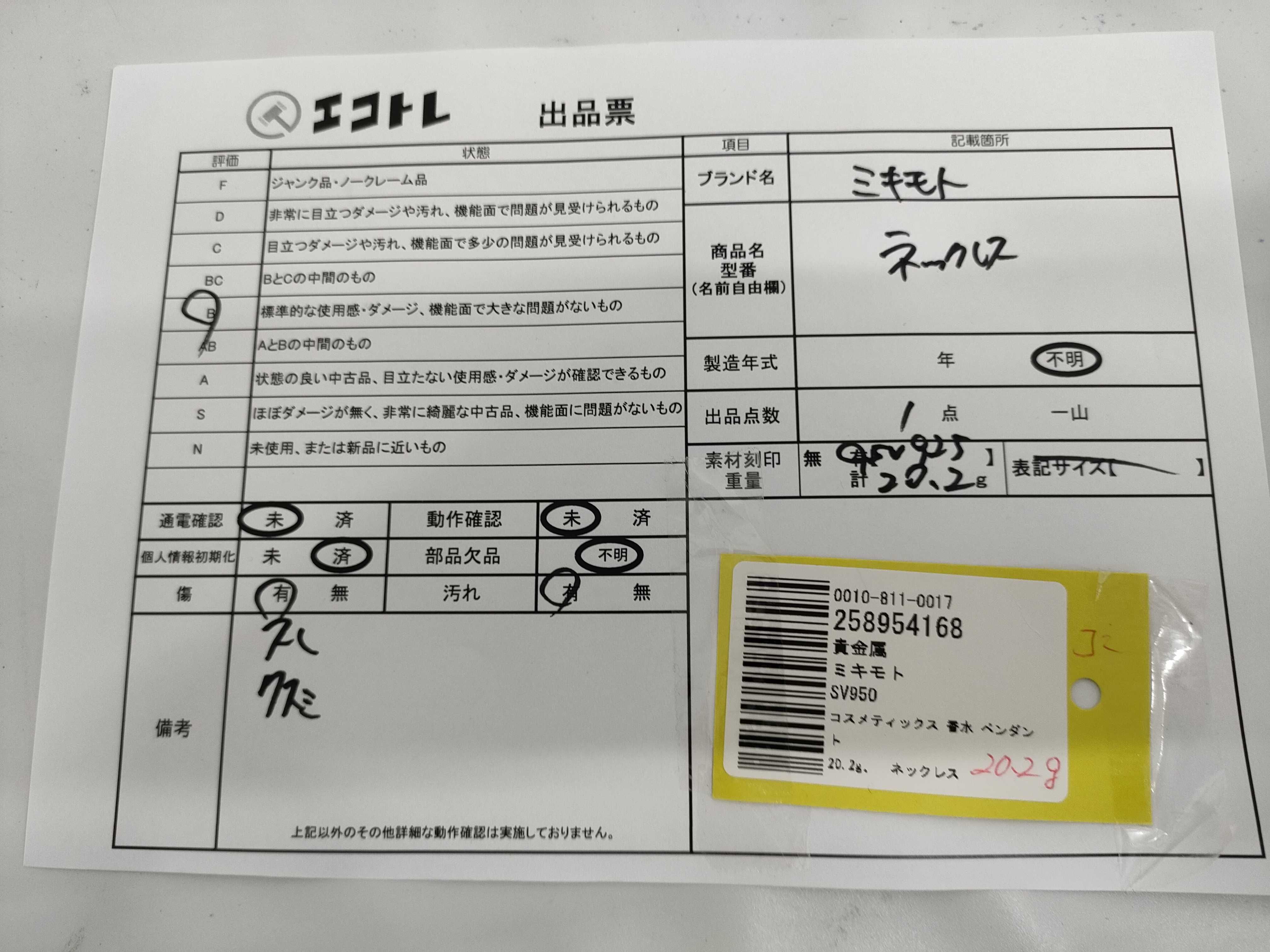 商品内容によって、JITBOXなどでの発送となる可能性がございます事ご理解下さい。年式などの商品情報詳細は写真にてご確認願います。※ご入札の際はご利用規約をよくお読みになってからのご参加お願いします。","タイプライン":"","カテゴリ":"アクセサリー","形状コード":"ネックレス","付属品コード":"","シリアル・シール・型番":""