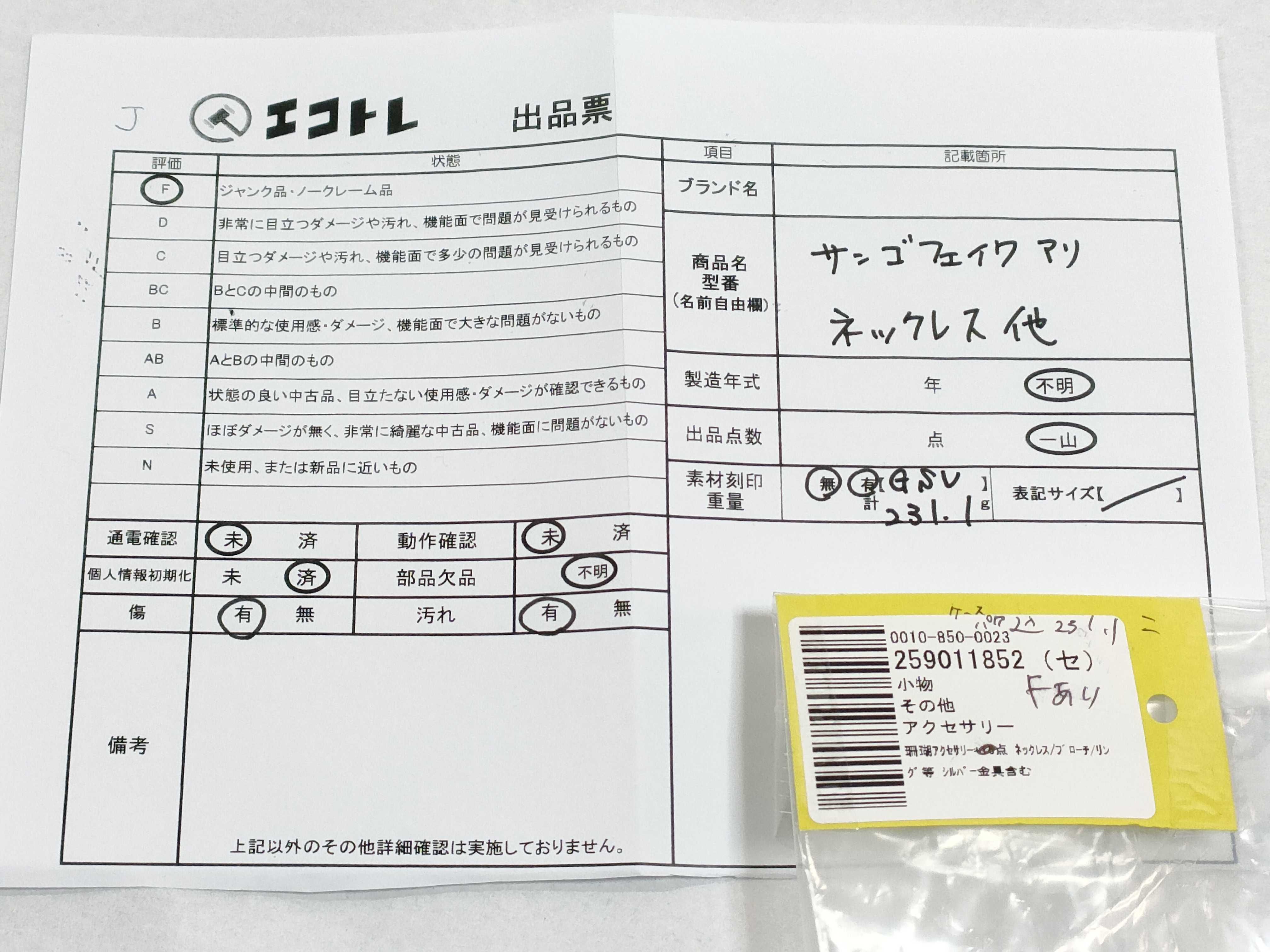 商品内容によって、JITBOXなどでの発送となる可能性がございます事ご理解下さい。年式などの商品情報詳細は写真にてご確認願います。※ご入札の際はご利用規約をよくお読みになってからのご参加お願いします。","タイプライン":"","カテゴリ":"アクセサリー","形状コード":"ネックレス","付属品コード":"","シリアル・シール・型番":""