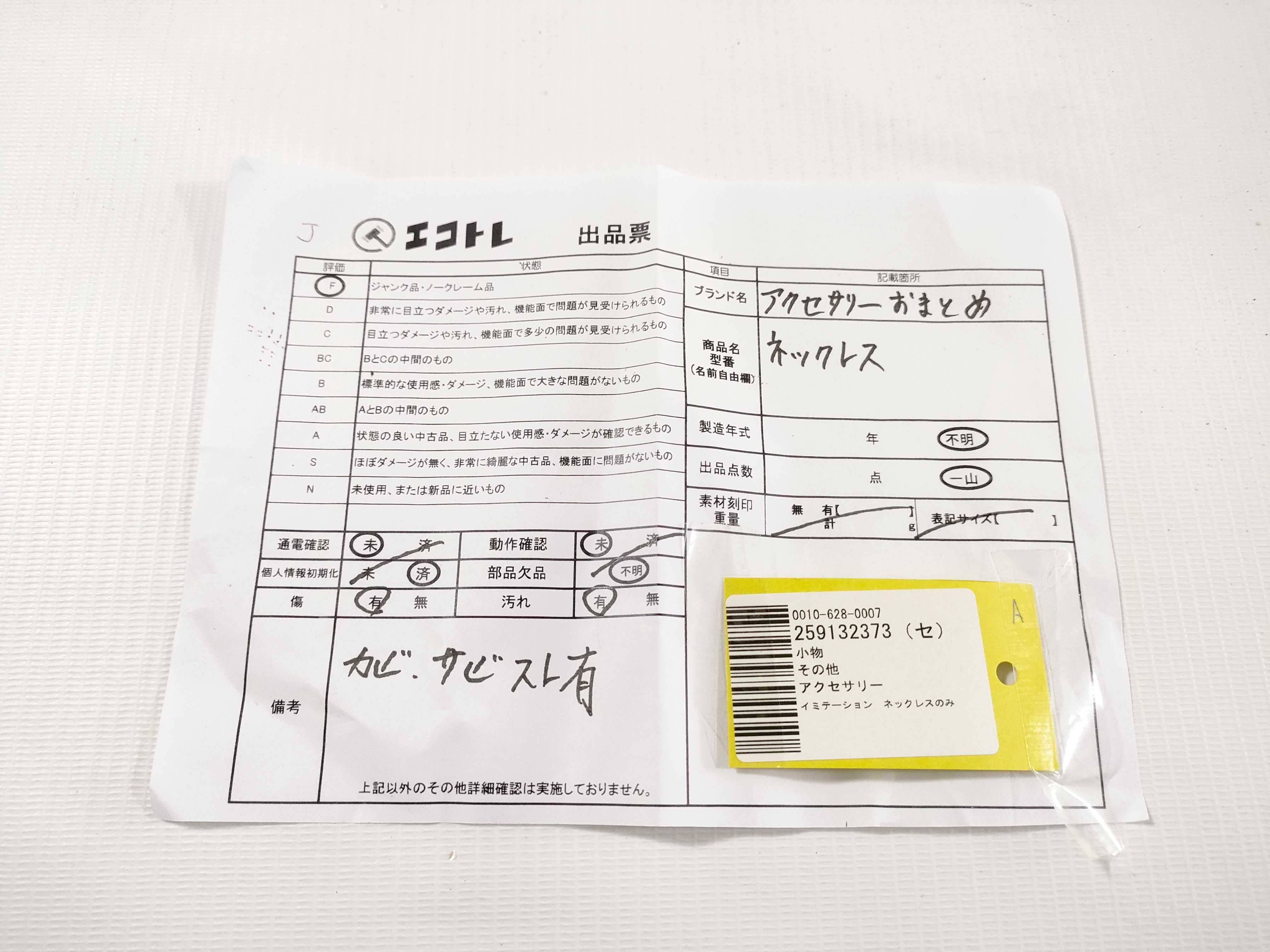 商品内容によって、JITBOXなどでの発送となる可能性がございます事ご理解下さい。年式などの商品情報詳細は写真にてご確認願います。※ご入札の際はご利用規約をよくお読みになってからのご参加お願いします。","タイプライン":"","カテゴリ":"アクセサリー","形状コード":"ネックレス","付属品コード":"","シリアル・シール・型番":""