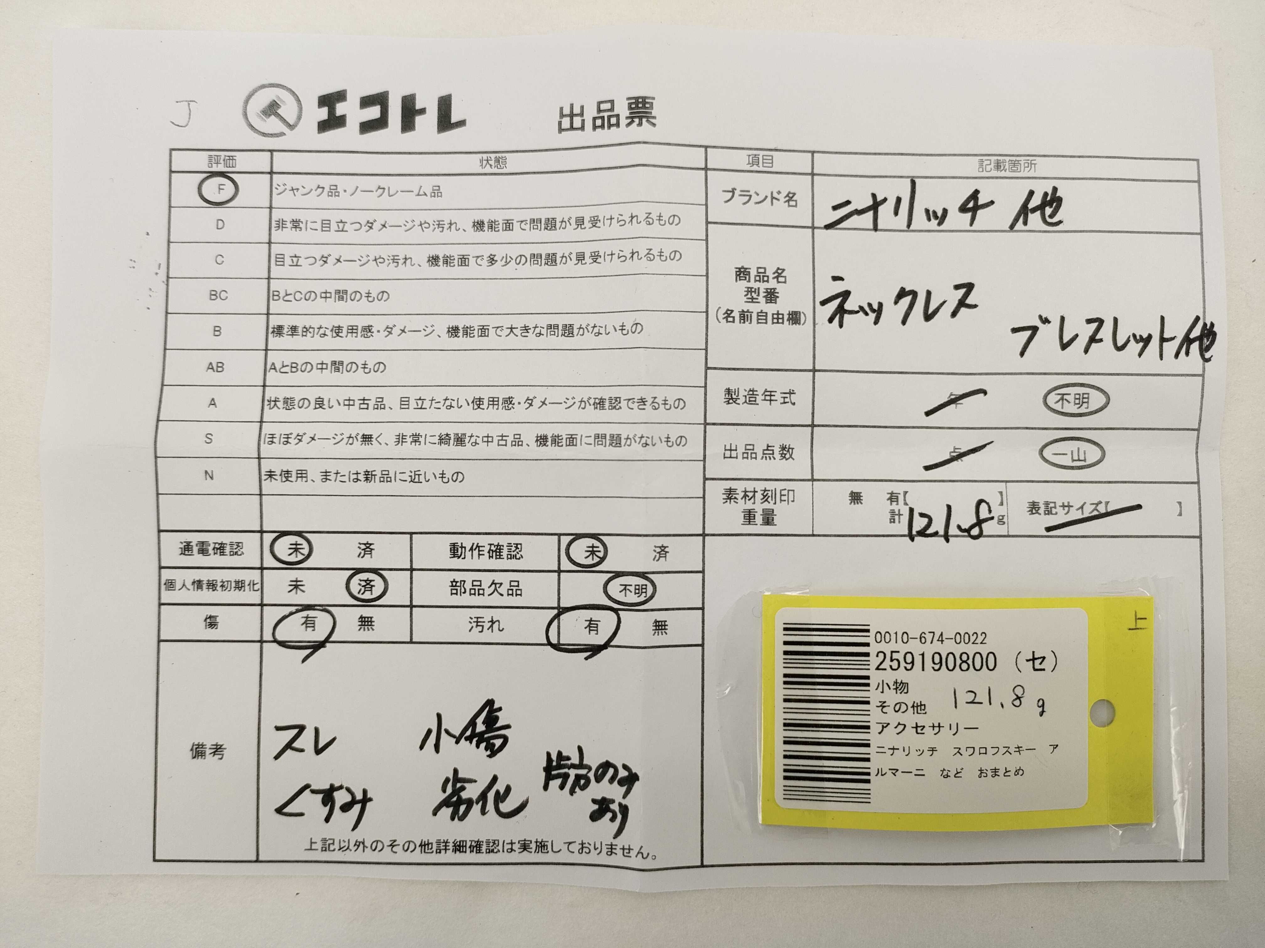 商品内容によって、JITBOXなどでの発送となる可能性がございます事ご理解下さい。年式などの商品情報詳細は写真にてご確認願います。※ご入札の際はご利用規約をよくお読みになってからのご参加お願いします。","タイプライン":"","カテゴリ":"アクセサリー","形状コード":"ネックレス","付属品コード":"","シリアル・シール・型番":""