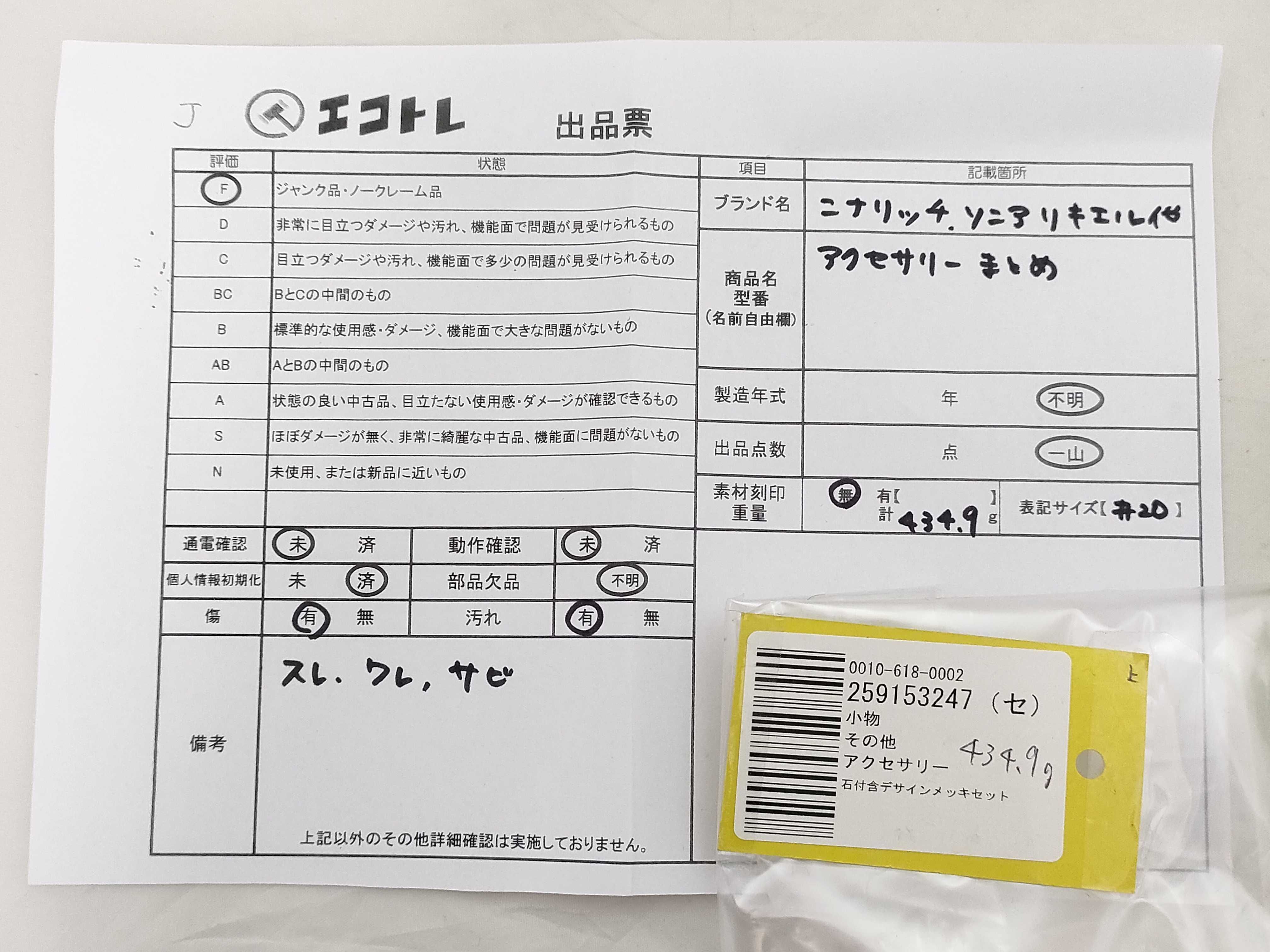商品内容によって、JITBOXなどでの発送となる可能性がございます事ご理解下さい。年式などの商品情報詳細は写真にてご確認願います。※ご入札の際はご利用規約をよくお読みになってからのご参加お願いします。","タイプライン":"","カテゴリ":"アクセサリー","形状コード":"アクセサリーまとめ","付属品コード":"","シリアル・シール・型番":""