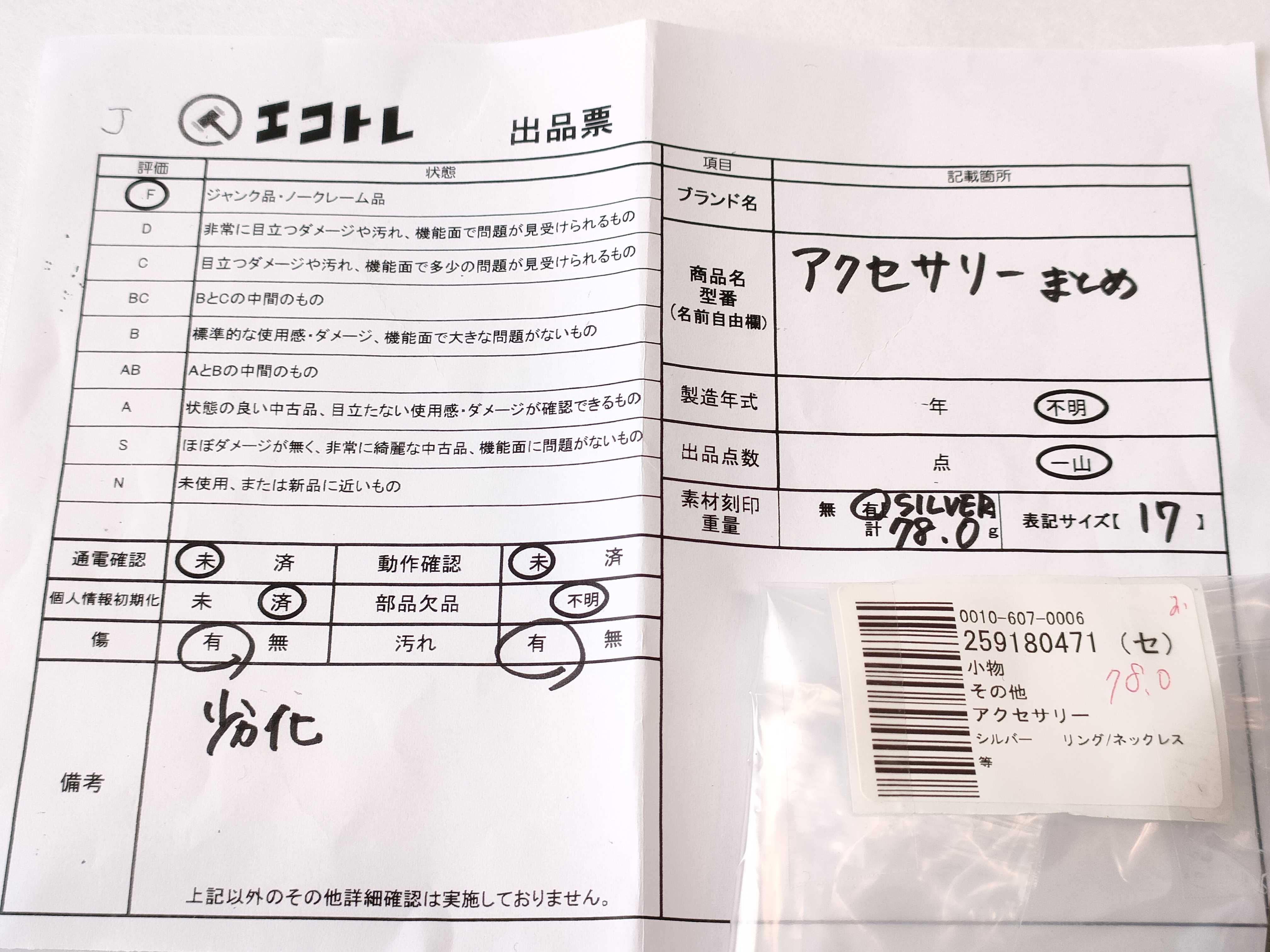 商品内容によって、JITBOXなどでの発送となる可能性がございます事ご理解下さい。年式などの商品情報詳細は写真にてご確認願います。※ご入札の際はご利用規約をよくお読みになってからのご参加お願いします。","タイプライン":"","カテゴリ":"アクセサリー","形状コード":"アクセサリーまとめ","付属品コード":"","シリアル・シール・型番":""