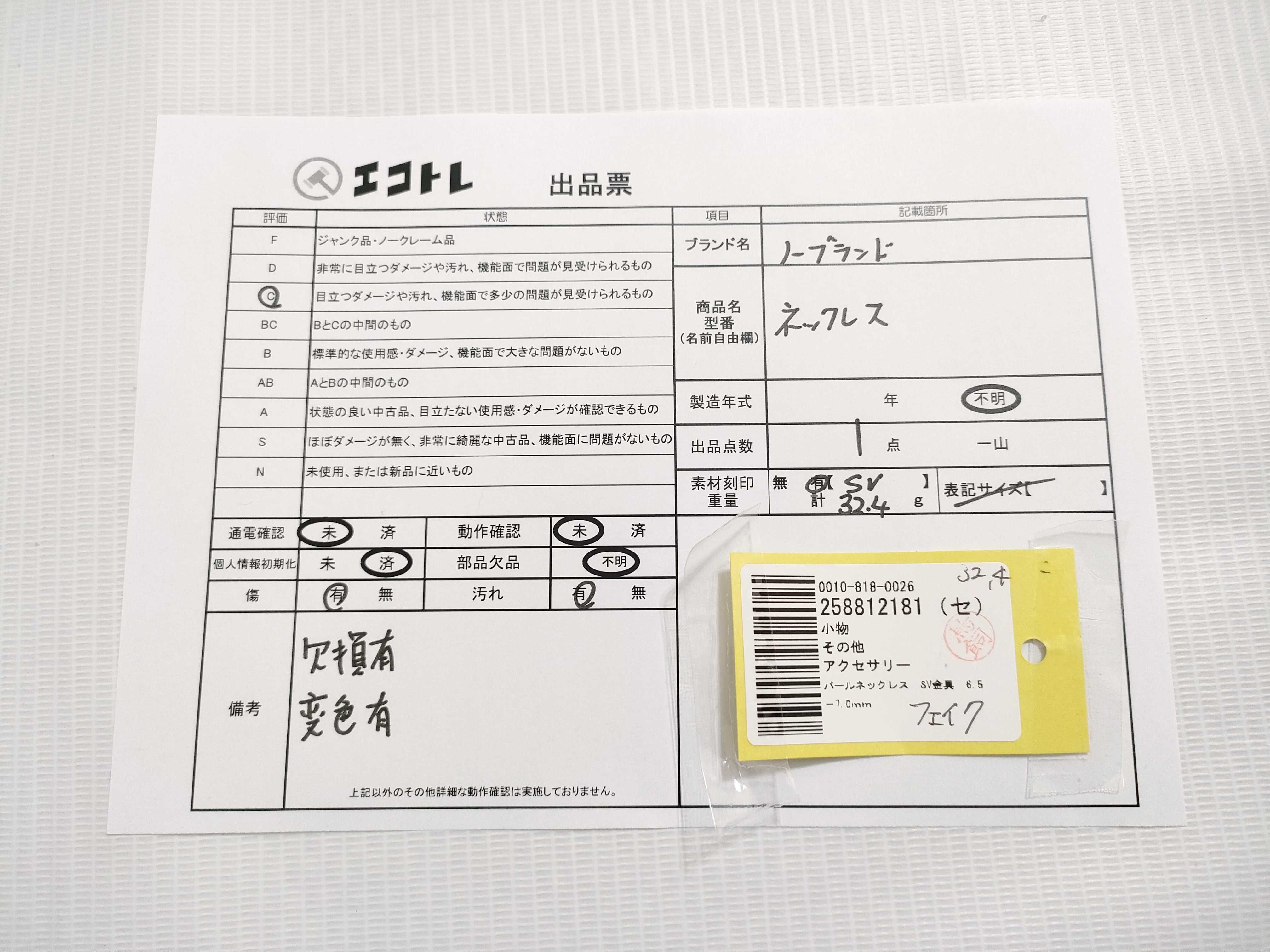 商品内容によって、JITBOXなどでの発送となる可能性がございます事ご理解下さい。年式などの商品情報詳細は写真にてご確認願います。※ご入札の際はご利用規約をよくお読みになってからのご参加お願いします。","タイプライン":"","カテゴリ":"アクセサリー","形状コード":"ネックレス","付属品コード":"","シリアル・シール・型番":""