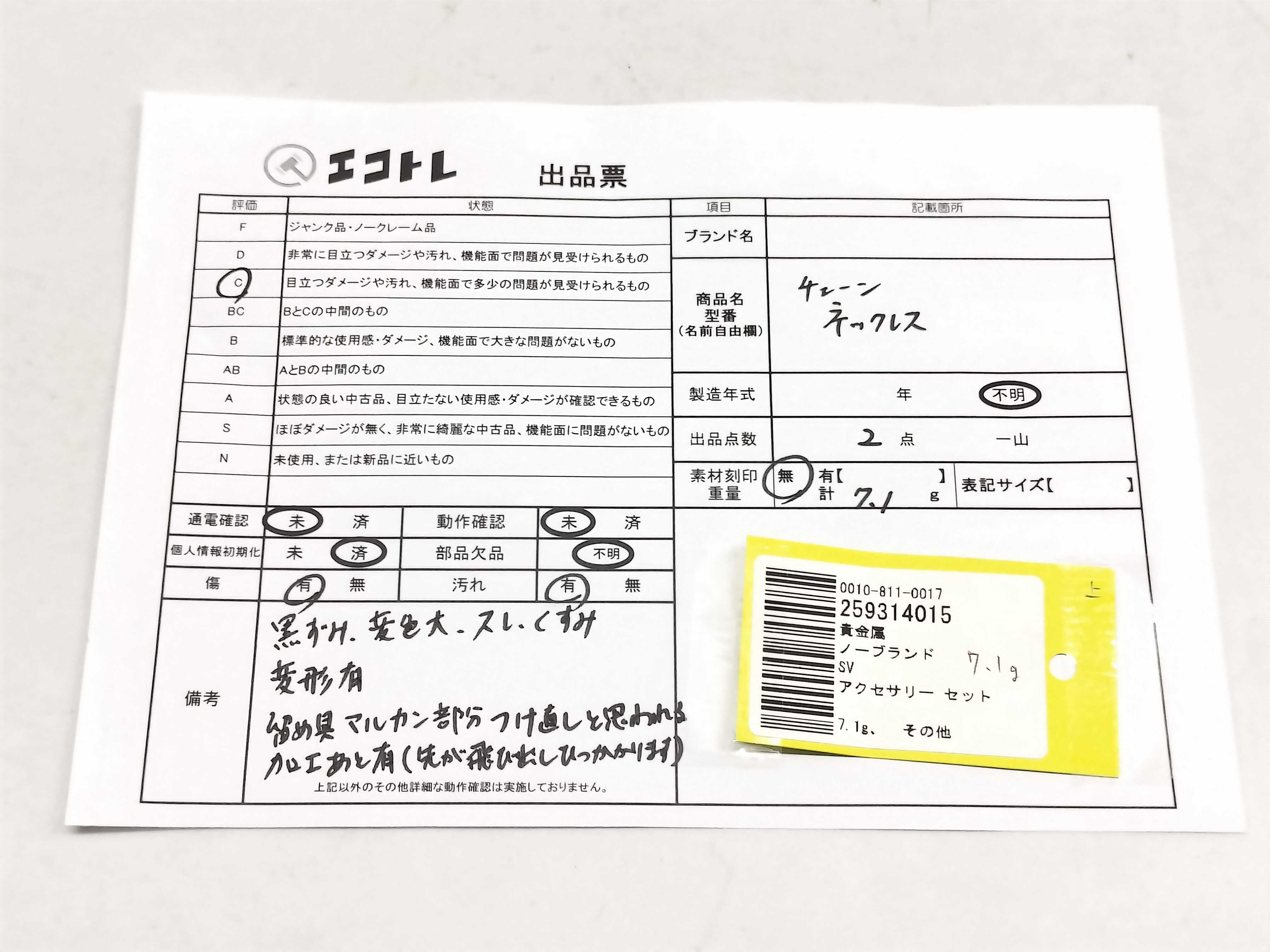 商品内容によって、JITBOXなどでの発送となる可能性がございます事ご理解下さい。年式などの商品情報詳細は写真にてご確認願います。※ご入札の際はご利用規約をよくお読みになってからのご参加お願いします。","タイプライン":"","カテゴリ":"アクセサリー","形状コード":"ネックレス","付属品コード":"","シリアル・シール・型番":""