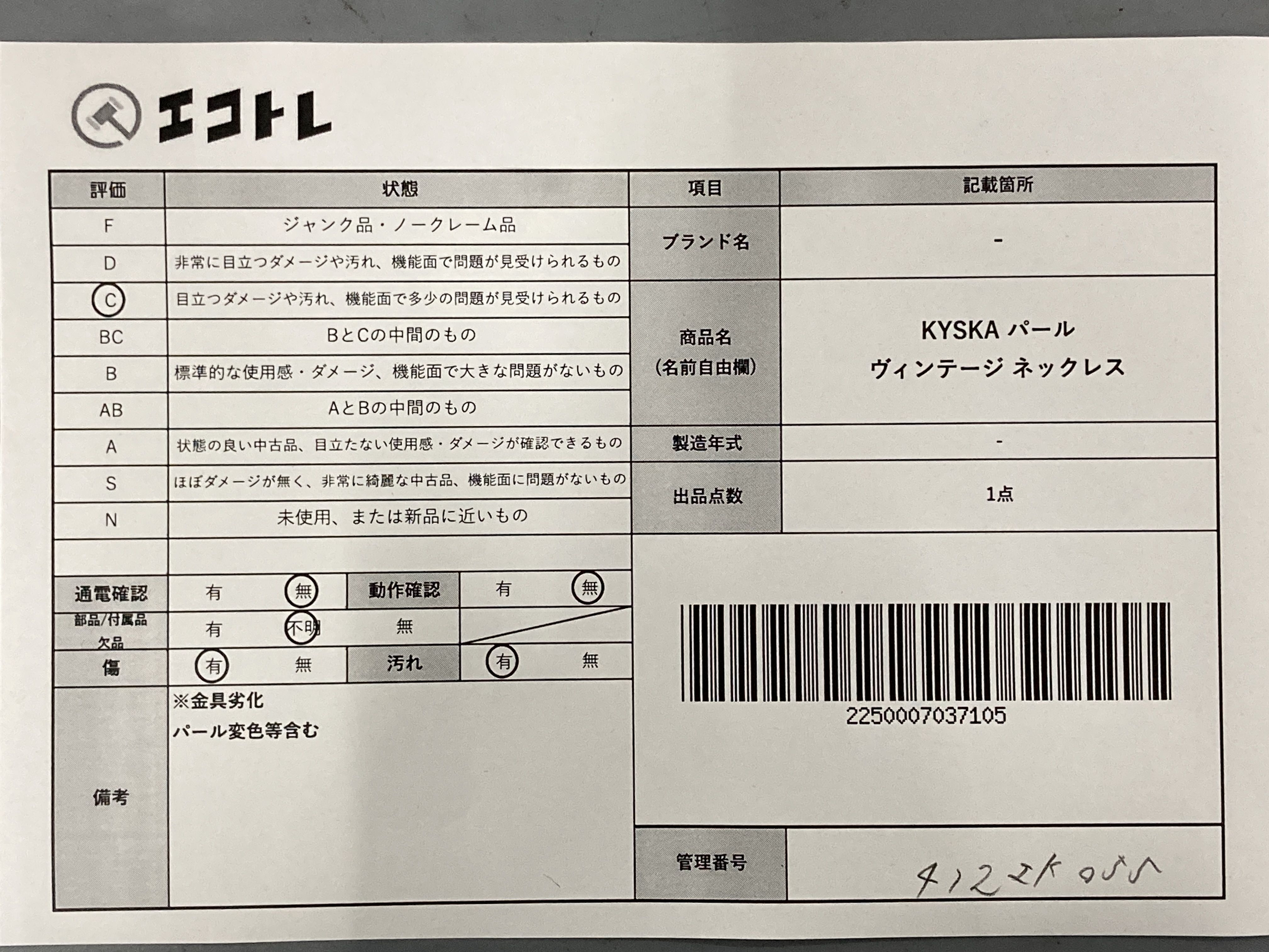 商品内容によって、JITBOXなどでの発送となる可能性がございます事ご理解下さい。年式などの商品情報詳細は写真にてご確認願います。※ご入札の際はご利用規約をよくお読みになってからのご参加お願いします。","タイプライン":"","カテゴリ":"アクセサリー","形状コード":"ネックレス","付属品コード":"","シリアル・シール・型番":""