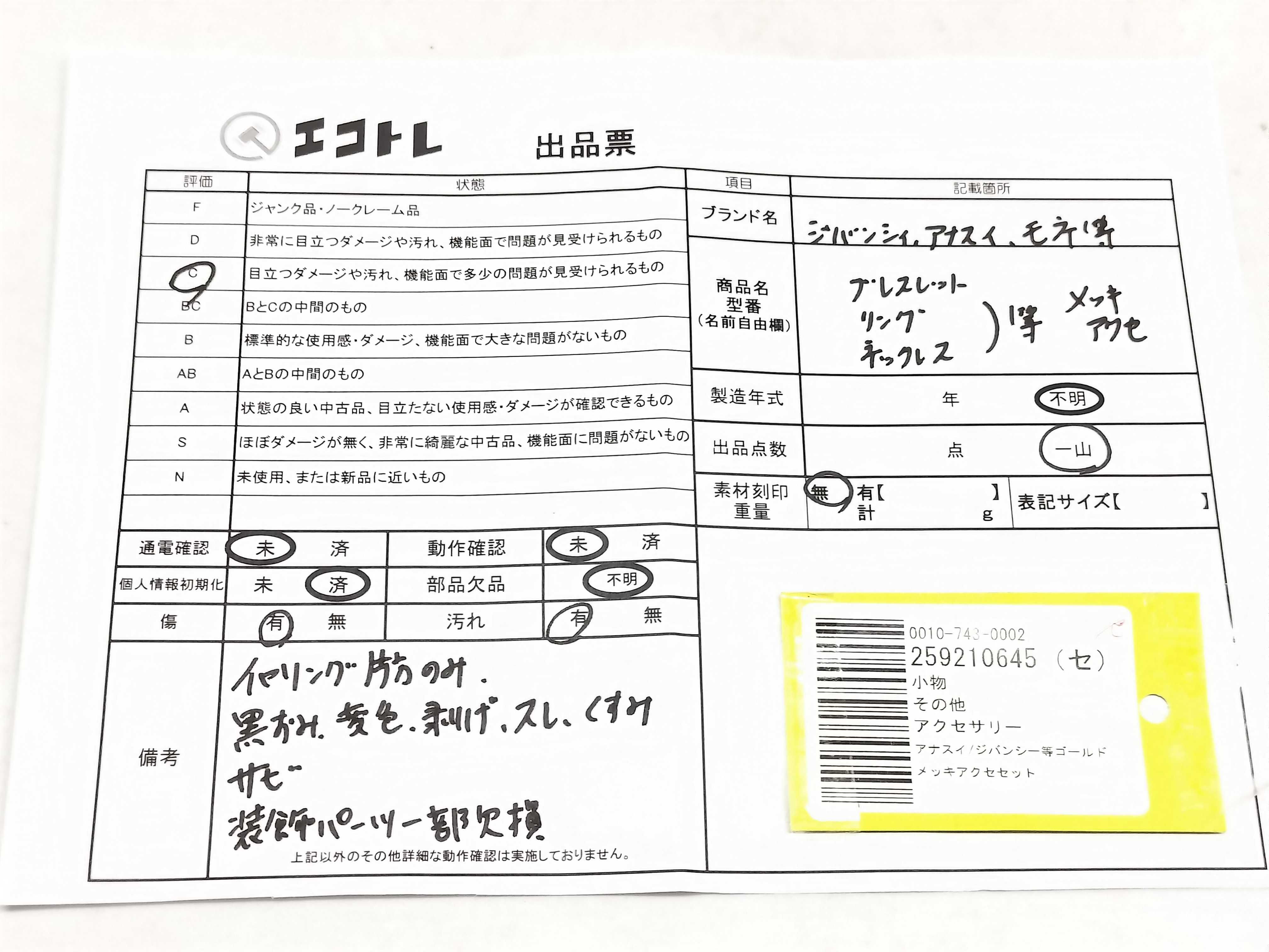 商品内容によって、JITBOXなどでの発送となる可能性がございます事ご理解下さい。年式などの商品情報詳細は写真にてご確認願います。※ご入札の際はご利用規約をよくお読みになってからのご参加お願いします。","タイプライン":"","カテゴリ":"アクセサリー","形状コード":"アクセサリーまとめ","付属品コード":"","シリアル・シール・型番":""