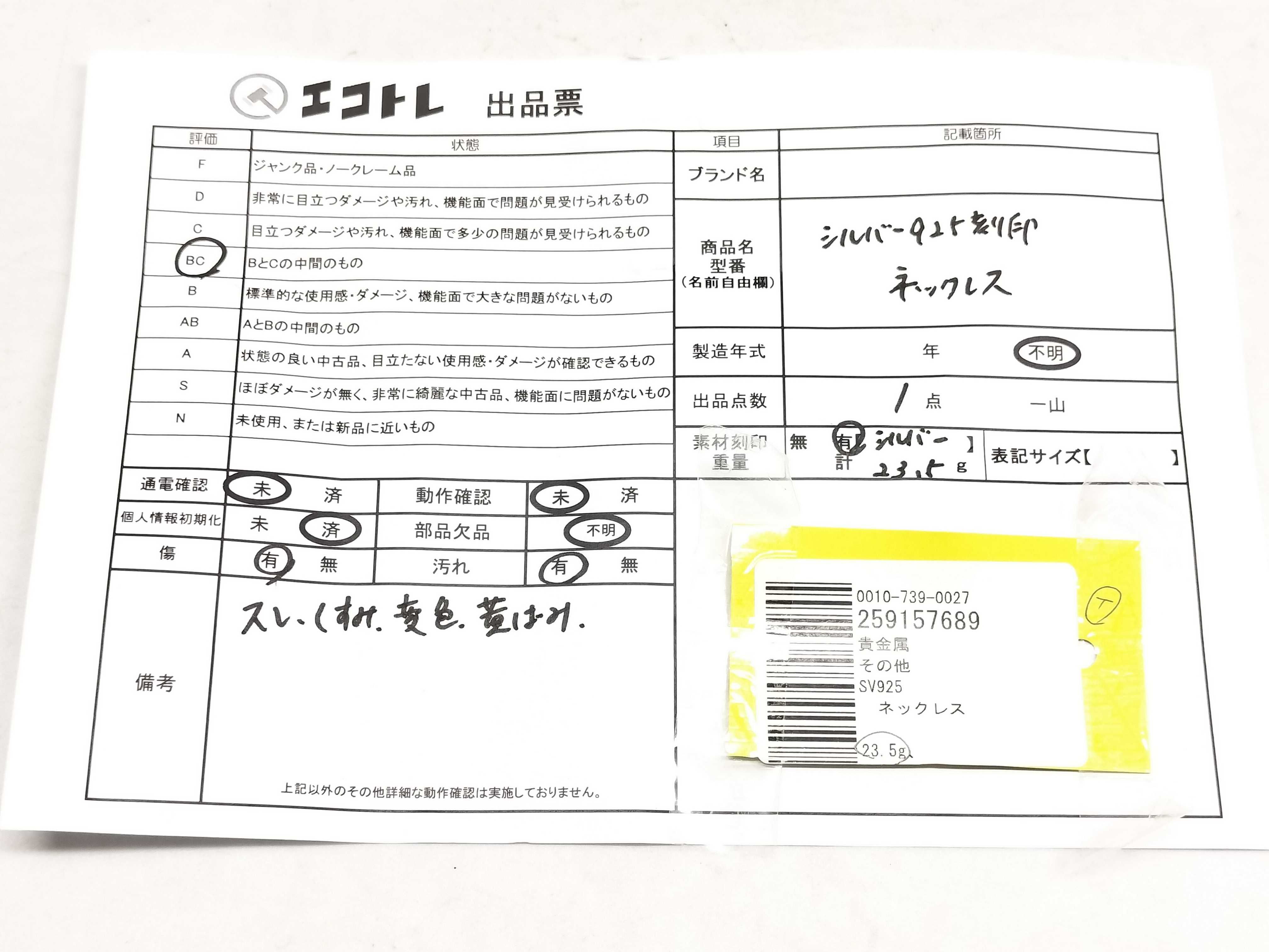 商品内容によって、JITBOXなどでの発送となる可能性がございます事ご理解下さい。年式などの商品情報詳細は写真にてご確認願います。※ご入札の際はご利用規約をよくお読みになってからのご参加お願いします。","タイプライン":"","カテゴリ":"アクセサリー","形状コード":"ネックレス","付属品コード":"","シリアル・シール・型番":""