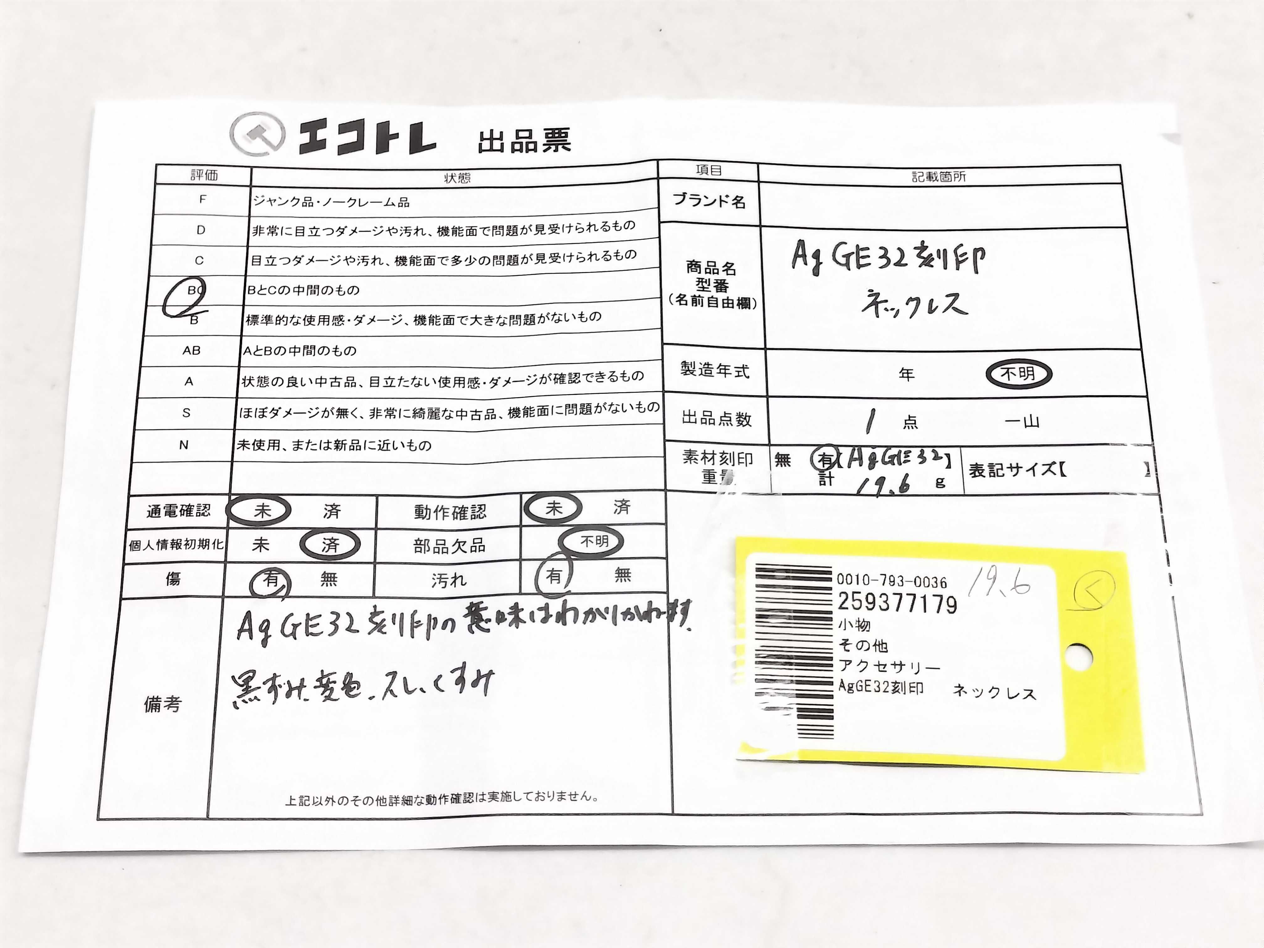 商品内容によって、JITBOXなどでの発送となる可能性がございます事ご理解下さい。年式などの商品情報詳細は写真にてご確認願います。※ご入札の際はご利用規約をよくお読みになってからのご参加お願いします。","タイプライン":"","カテゴリ":"アクセサリー","形状コード":"ネックレス","付属品コード":"","シリアル・シール・型番":""