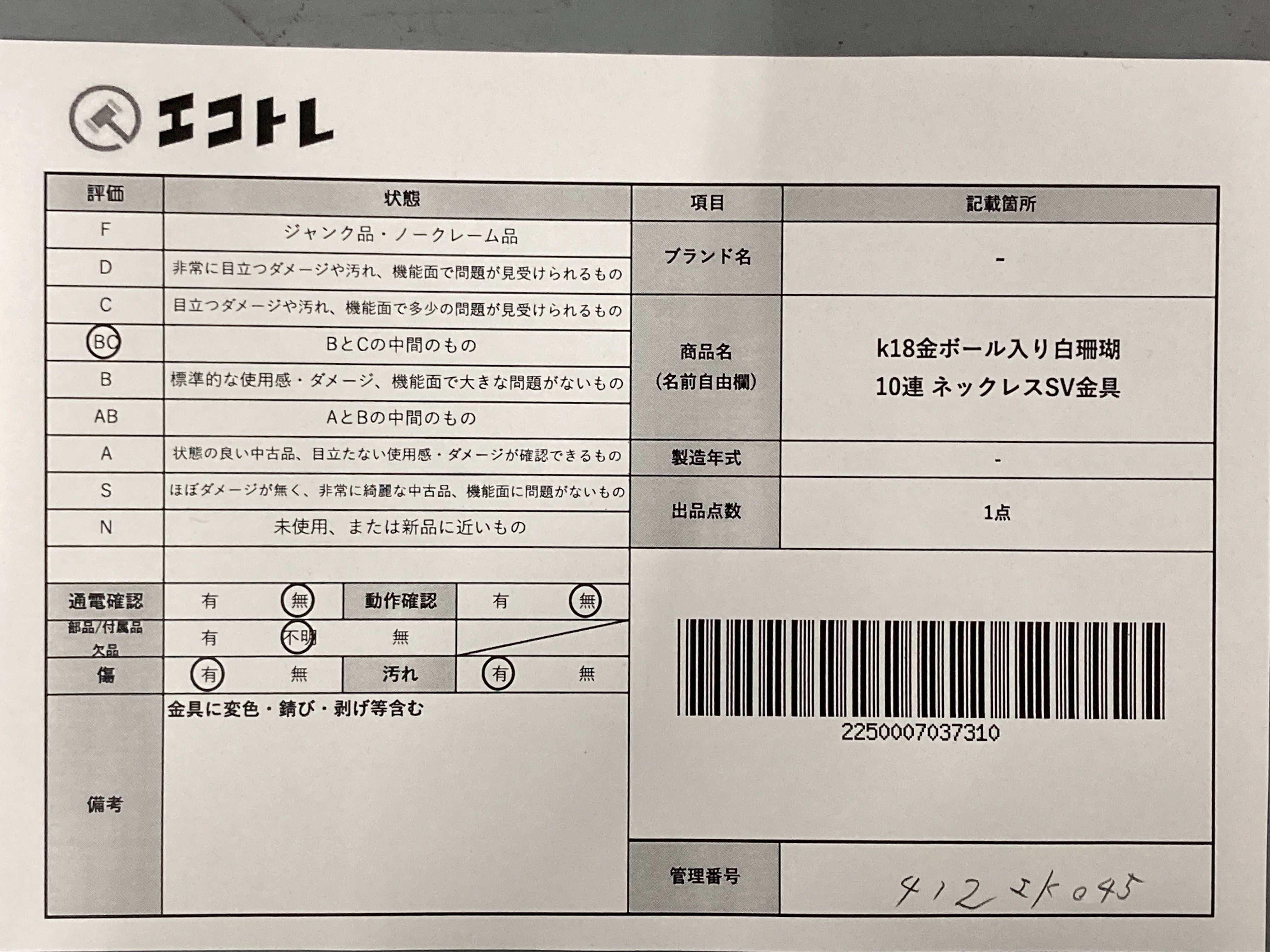 商品内容によって、JITBOXなどでの発送となる可能性がございます事ご理解下さい。年式などの商品情報詳細は写真にてご確認願います。※ご入札の際はご利用規約をよくお読みになってからのご参加お願いします。","タイプライン":"","カテゴリ":"アクセサリー","形状コード":"ネックレス","付属品コード":"","シリアル・シール・型番":""