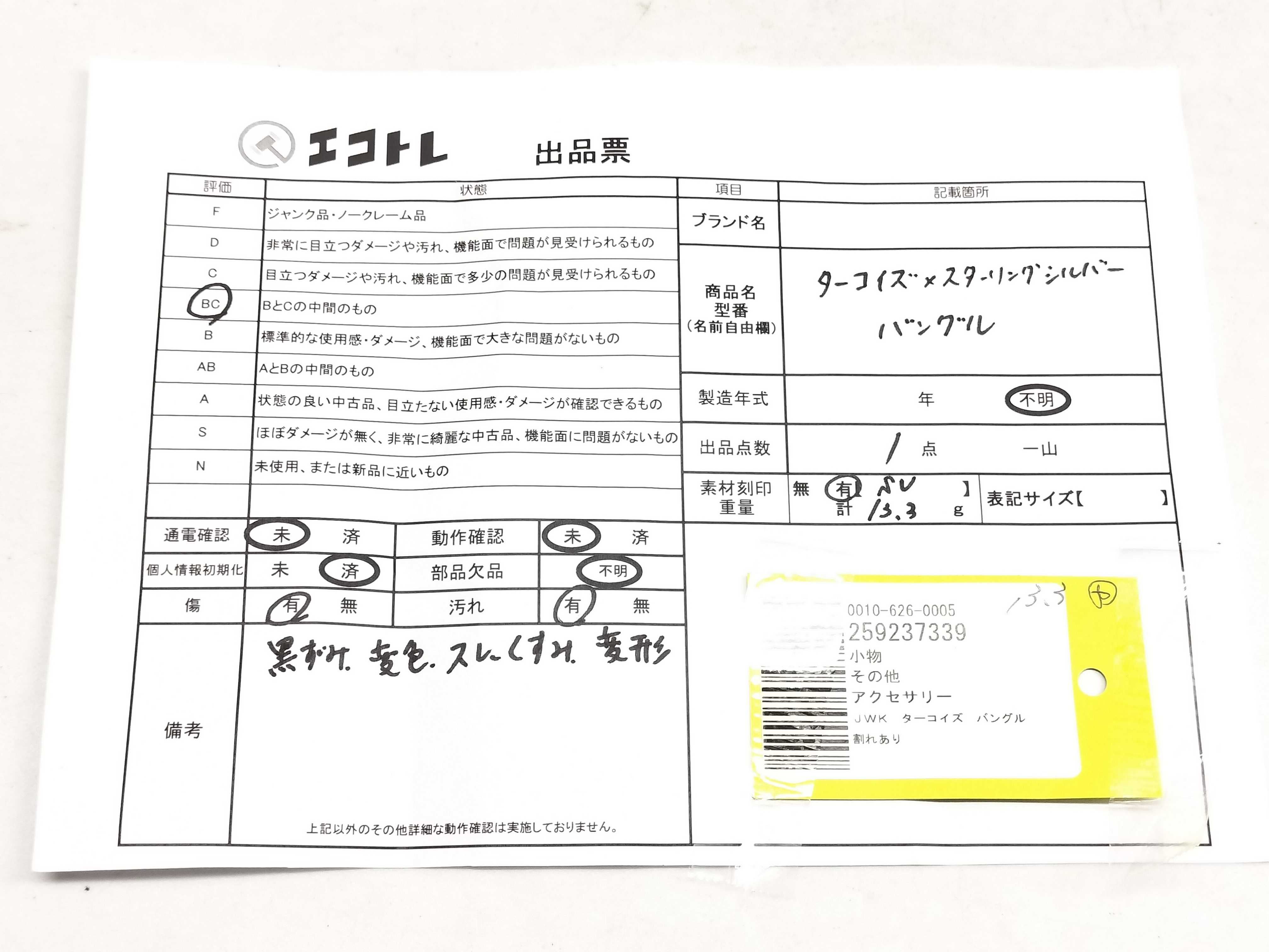 商品内容によって、JITBOXなどでの発送となる可能性がございます事ご理解下さい。年式などの商品情報詳細は写真にてご確認願います。※ご入札の際はご利用規約をよくお読みになってからのご参加お願いします。","タイプライン":"","カテゴリ":"アクセサリー","形状コード":"ブレスレット・バングル","付属品コード":"","シリアル・シール・型番":""