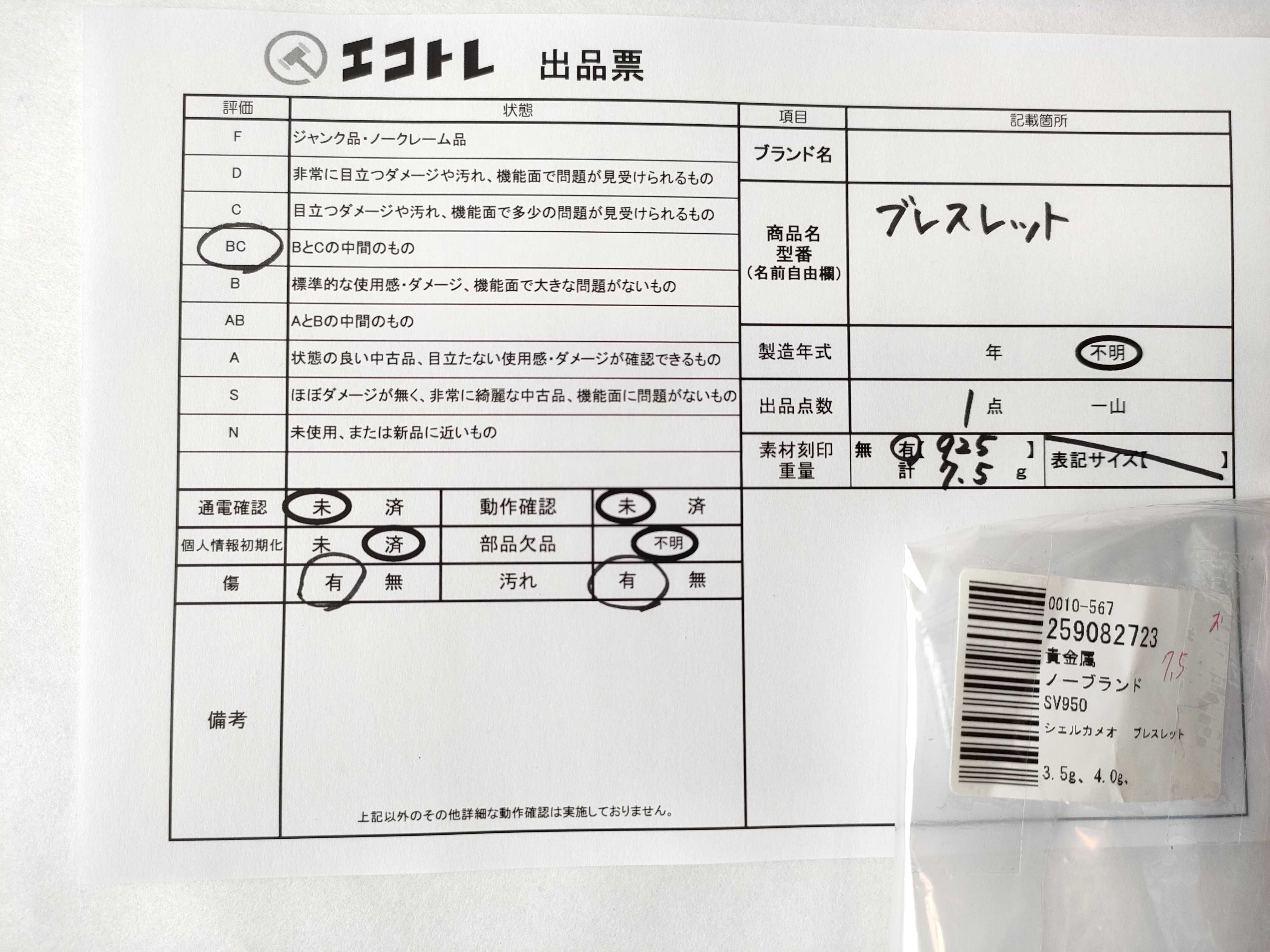 (C_0644)▼SV950 7.5g ブレスレット・バングル