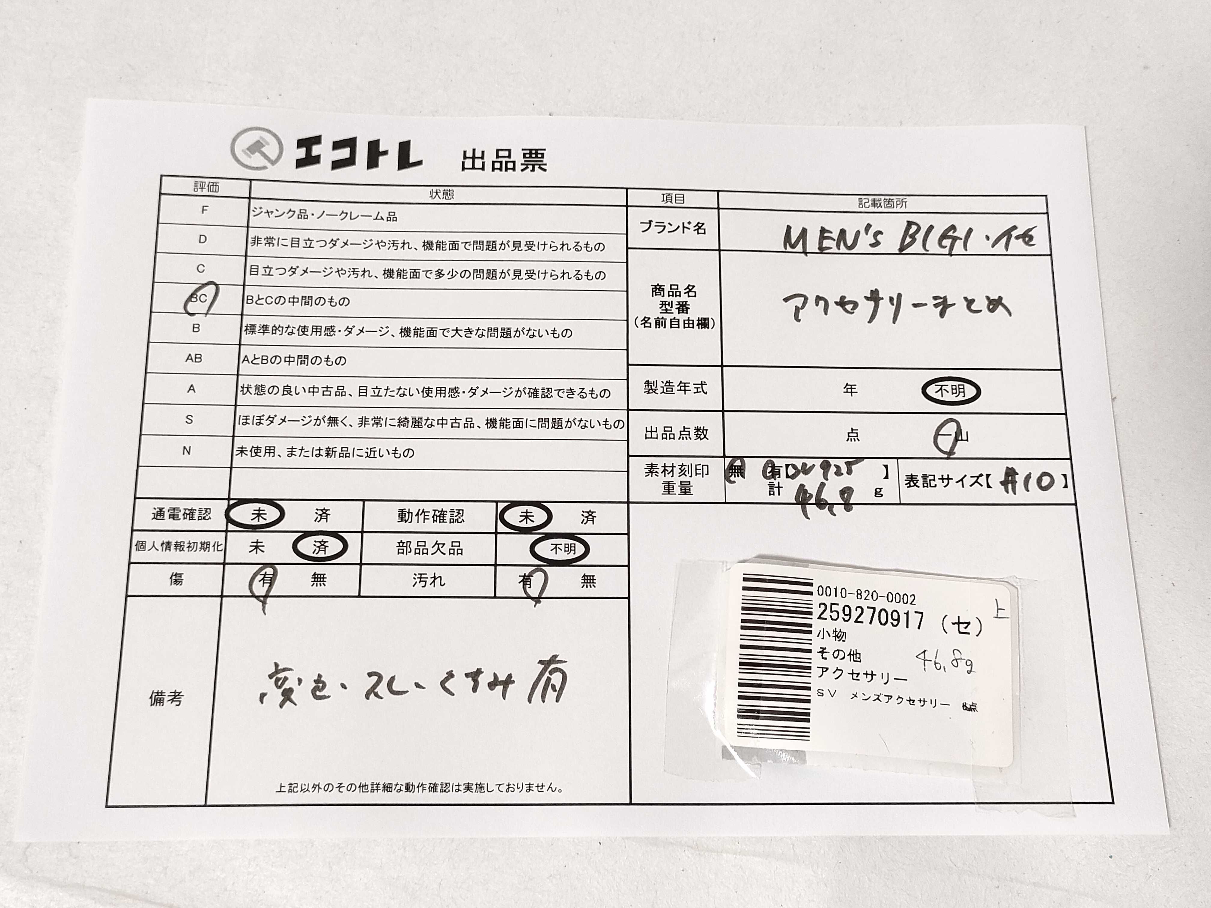 商品内容によって、JITBOXなどでの発送となる可能性がございます事ご理解下さい。年式などの商品情報詳細は写真にてご確認願います。※ご入札の際はご利用規約をよくお読みになってからのご参加お願いします。","タイプライン":"","カテゴリ":"アクセサリー","形状コード":"アクセサリーまとめ","付属品コード":"","シリアル・シール・型番":""
