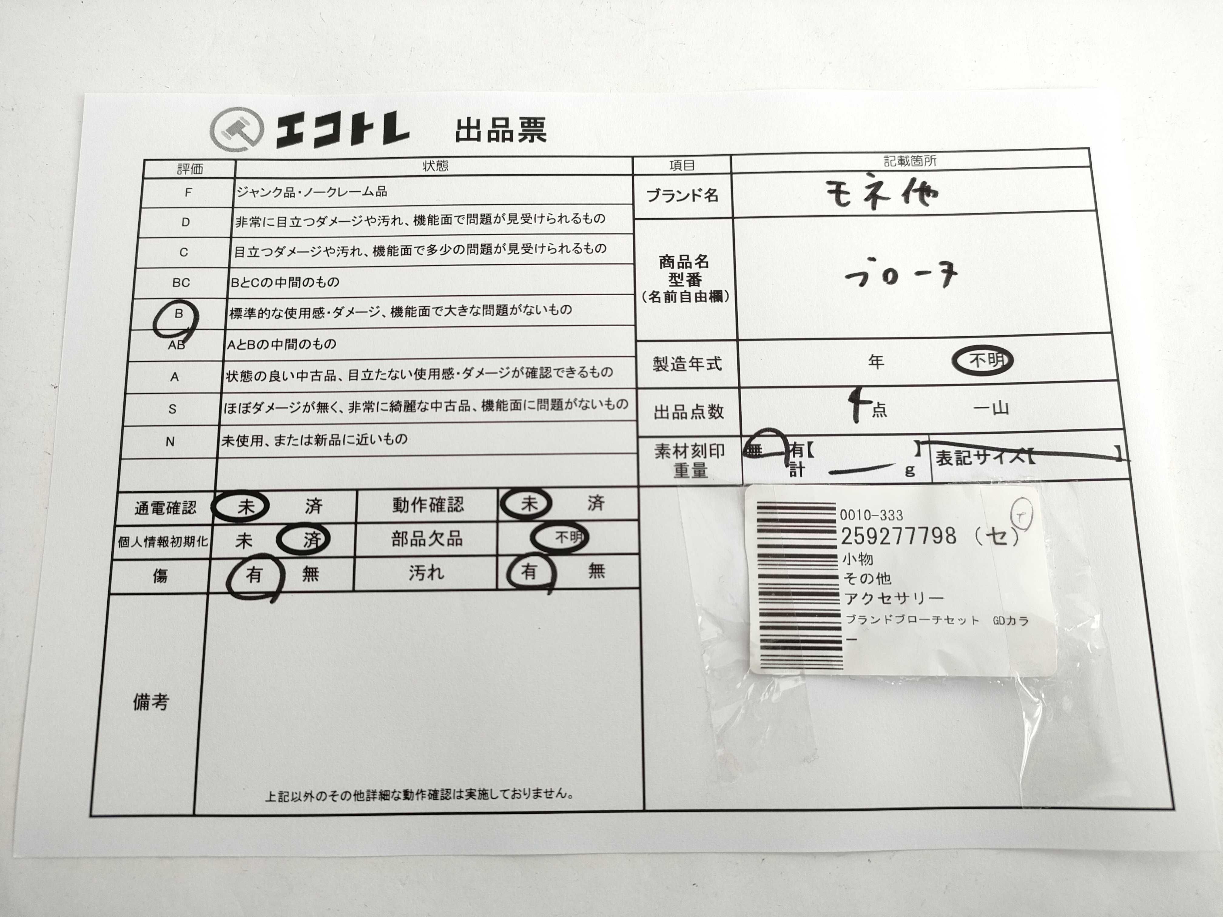 商品内容によって、JITBOXなどでの発送となる可能性がございます事ご理解下さい。年式などの商品情報詳細は写真にてご確認願います。※ご入札の際はご利用規約をよくお読みになってからのご参加お願いします。","タイプライン":"","カテゴリ":"アクセサリー","形状コード":"ブローチ","付属品コード":"","シリアル・シール・型番":""