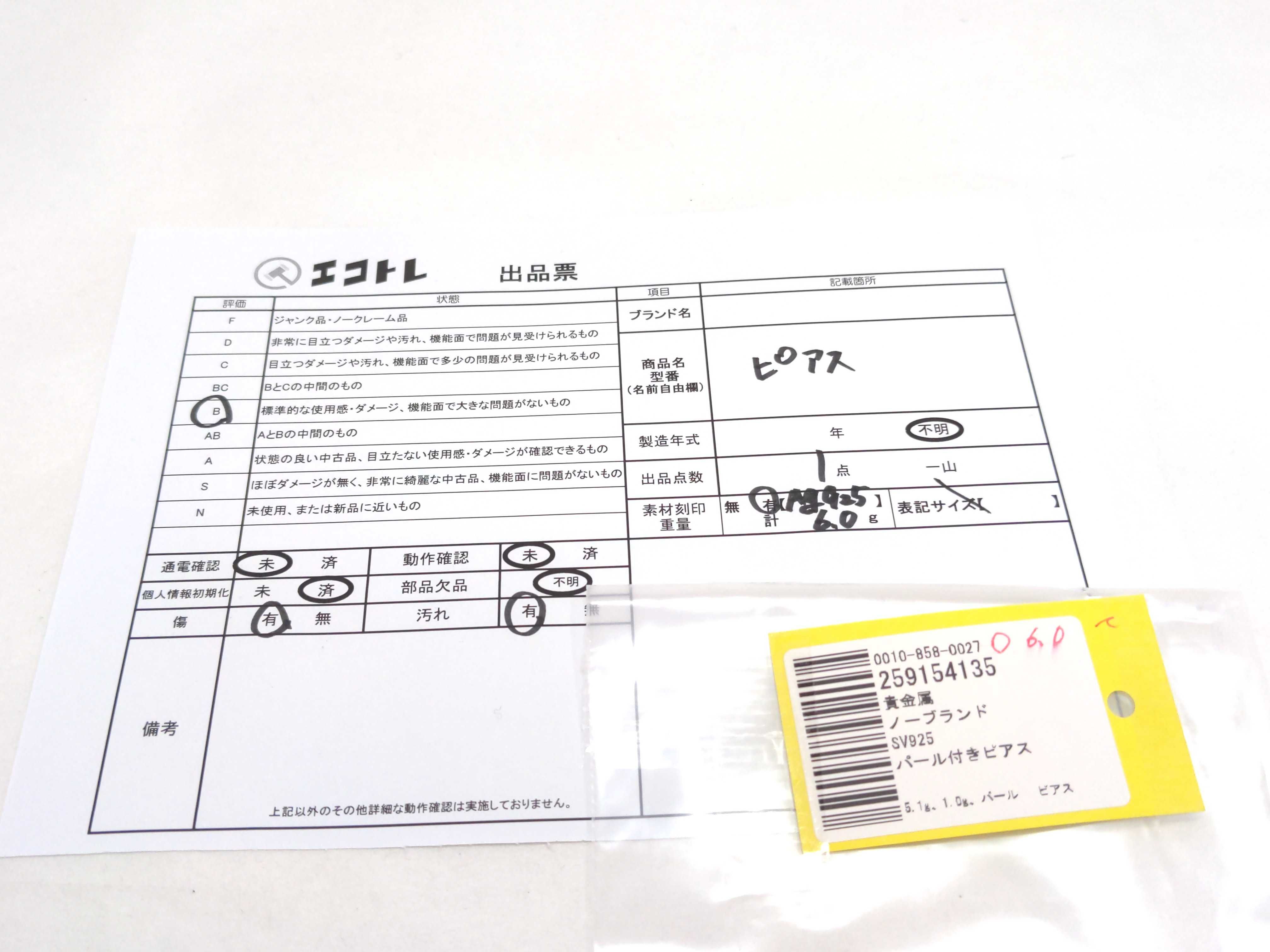 商品内容によって、JITBOXなどでの発送となる可能性がございます事ご理解下さい。年式などの商品情報詳細は写真にてご確認願います。※ご入札の際はご利用規約をよくお読みになってからのご参加お願いします。","タイプライン":"","カテゴリ":"アクセサリー","形状コード":"ピアス","付属品コード":"","シリアル・シール・型番":""