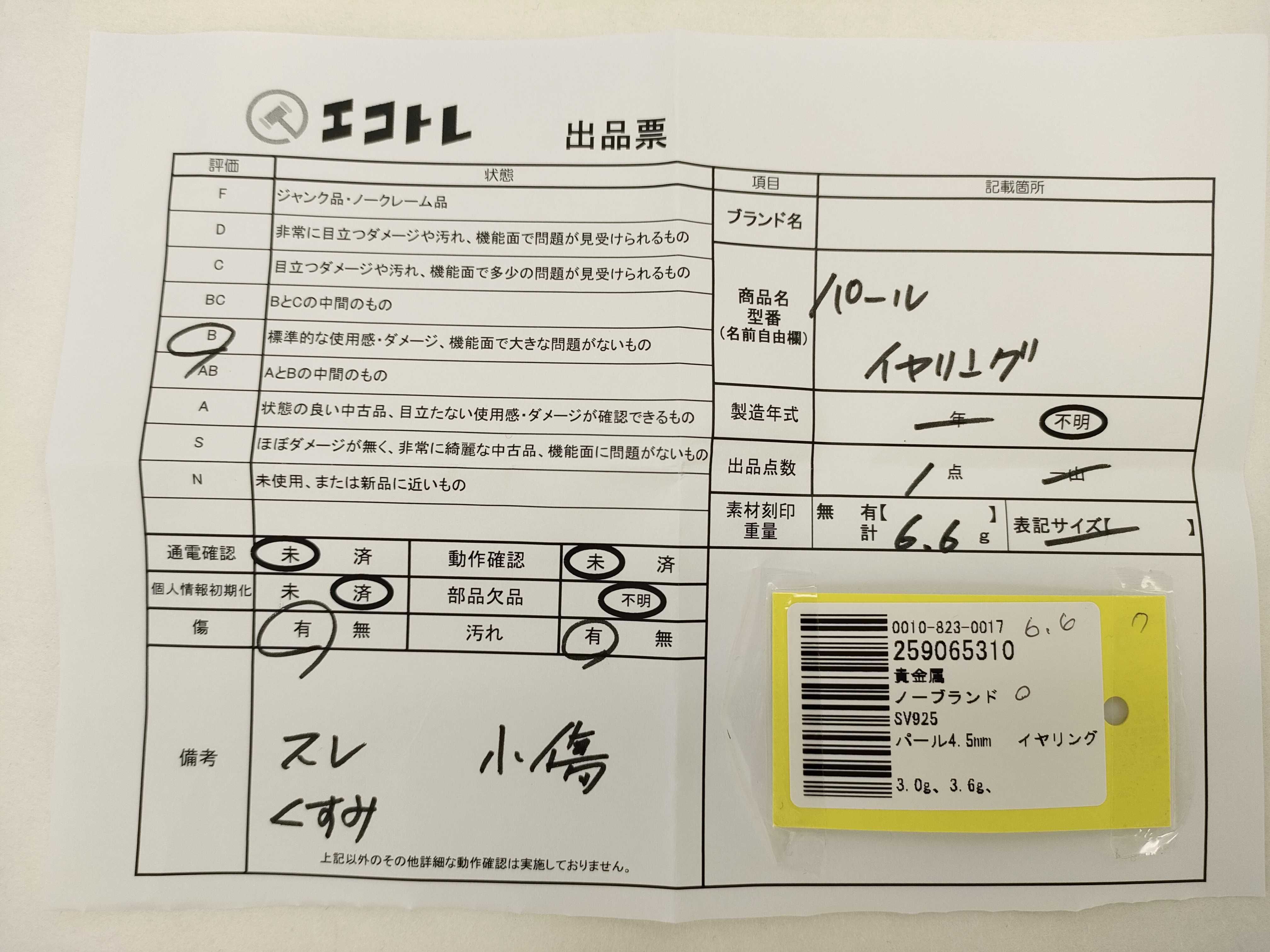 商品内容によって、JITBOXなどでの発送となる可能性がございます事ご理解下さい。年式などの商品情報詳細は写真にてご確認願います。※ご入札の際はご利用規約をよくお読みになってからのご参加お願いします。","タイプライン":"","カテゴリ":"アクセサリー","形状コード":"イヤリング","付属品コード":"","シリアル・シール・型番":""