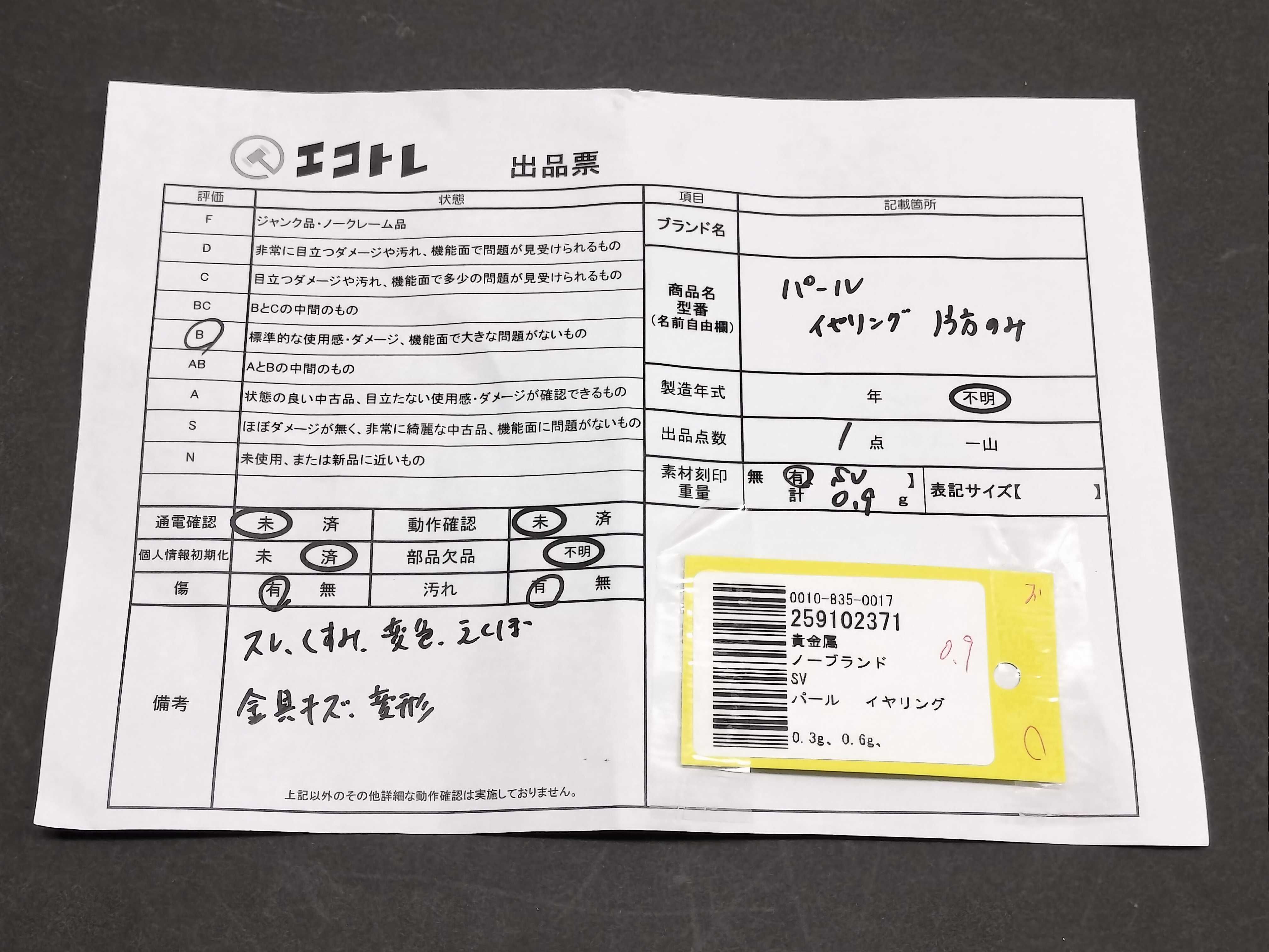 商品内容によって、JITBOXなどでの発送となる可能性がございます事ご理解下さい。年式などの商品情報詳細は写真にてご確認願います。※ご入札の際はご利用規約をよくお読みになってからのご参加お願いします。","タイプライン":"","カテゴリ":"アクセサリー","形状コード":"イヤリング","付属品コード":"","シリアル・シール・型番":""