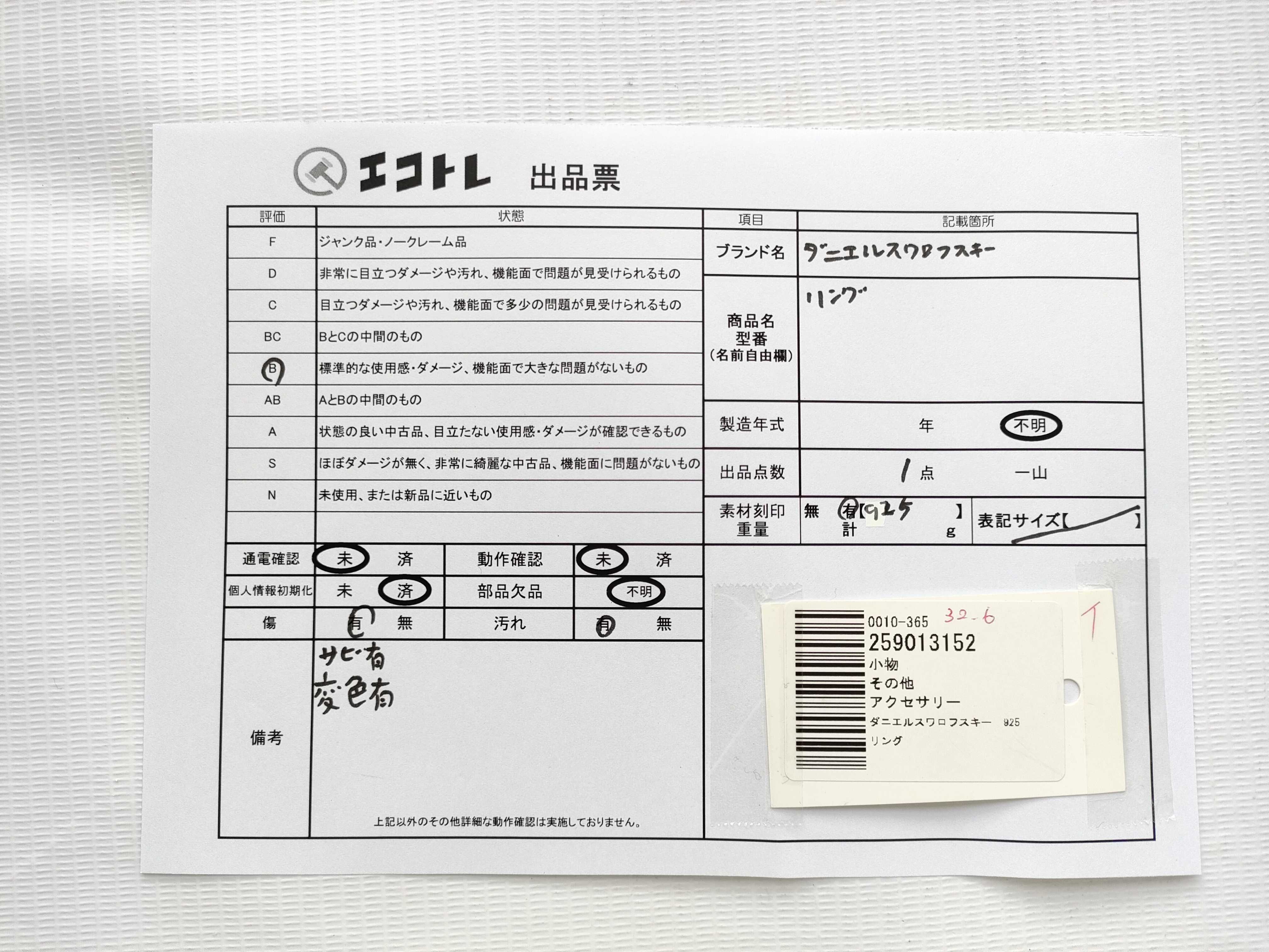 商品内容によって、JITBOXなどでの発送となる可能性がございます事ご理解下さい。年式などの商品情報詳細は写真にてご確認願います。※ご入札の際はご利用規約をよくお読みになってからのご参加お願いします。","タイプライン":"","カテゴリ":"アクセサリー","形状コード":"リング","付属品コード":"","シリアル・シール・型番":""