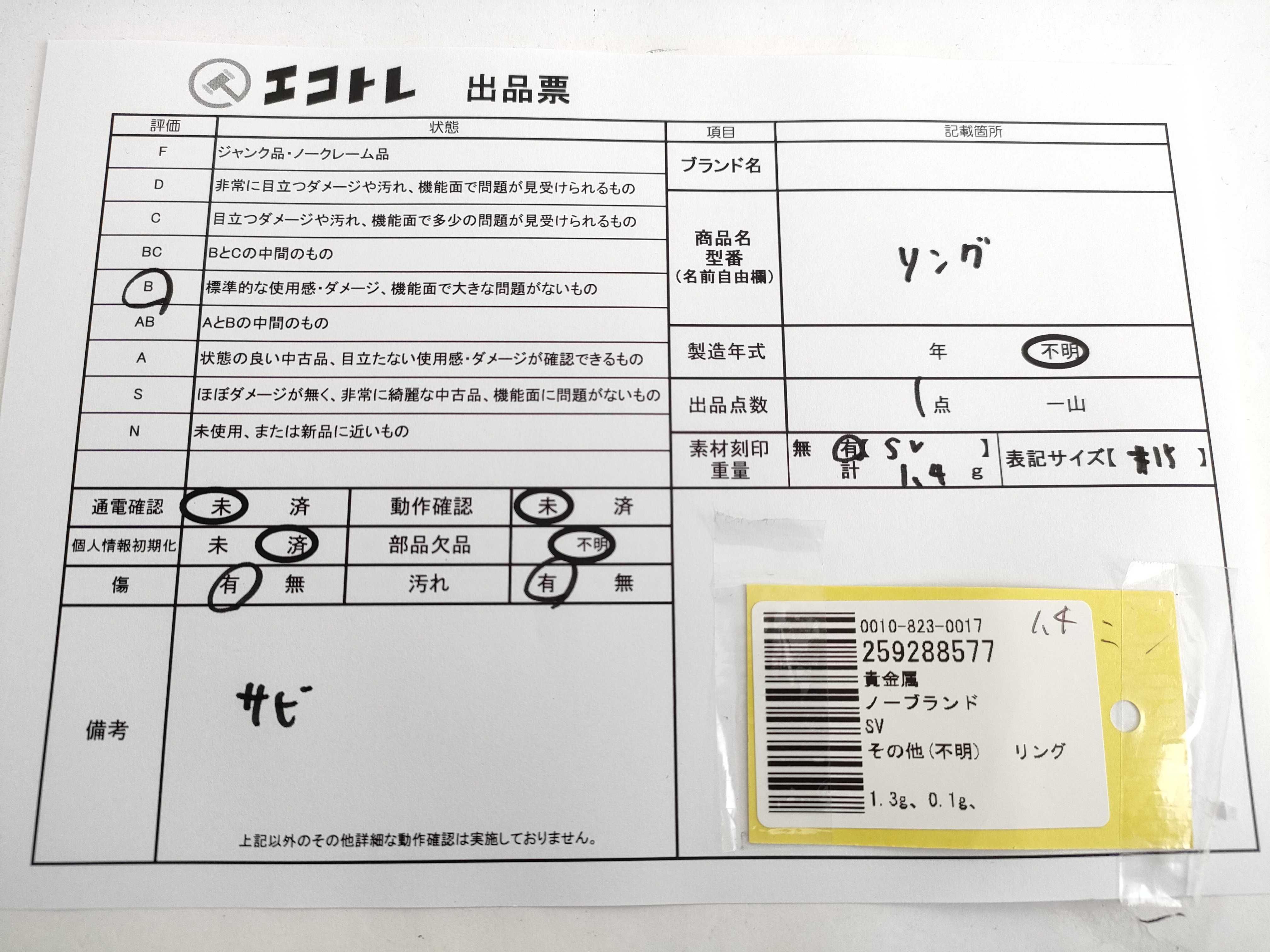 商品内容によって、JITBOXなどでの発送となる可能性がございます事ご理解下さい。年式などの商品情報詳細は写真にてご確認願います。※ご入札の際はご利用規約をよくお読みになってからのご参加お願いします。","タイプライン":"","カテゴリ":"アクセサリー","形状コード":"リング","付属品コード":"","シリアル・シール・型番":""