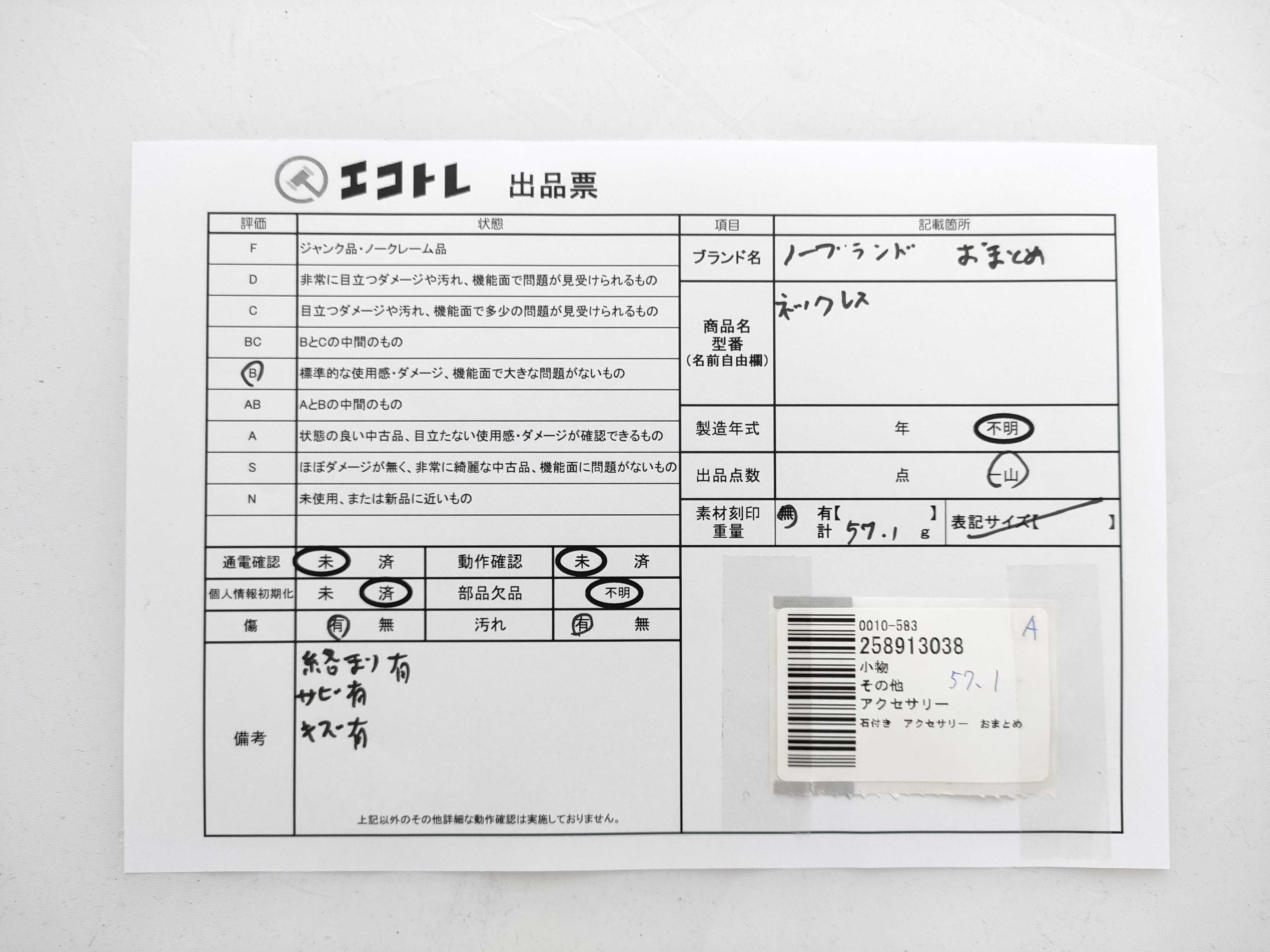 商品内容によって、JITBOXなどでの発送となる可能性がございます事ご理解下さい。年式などの商品情報詳細は写真にてご確認願います。※ご入札の際はご利用規約をよくお読みになってからのご参加お願いします。","タイプライン":"","カテゴリ":"アクセサリー","形状コード":"ネックレス","付属品コード":"","シリアル・シール・型番":""