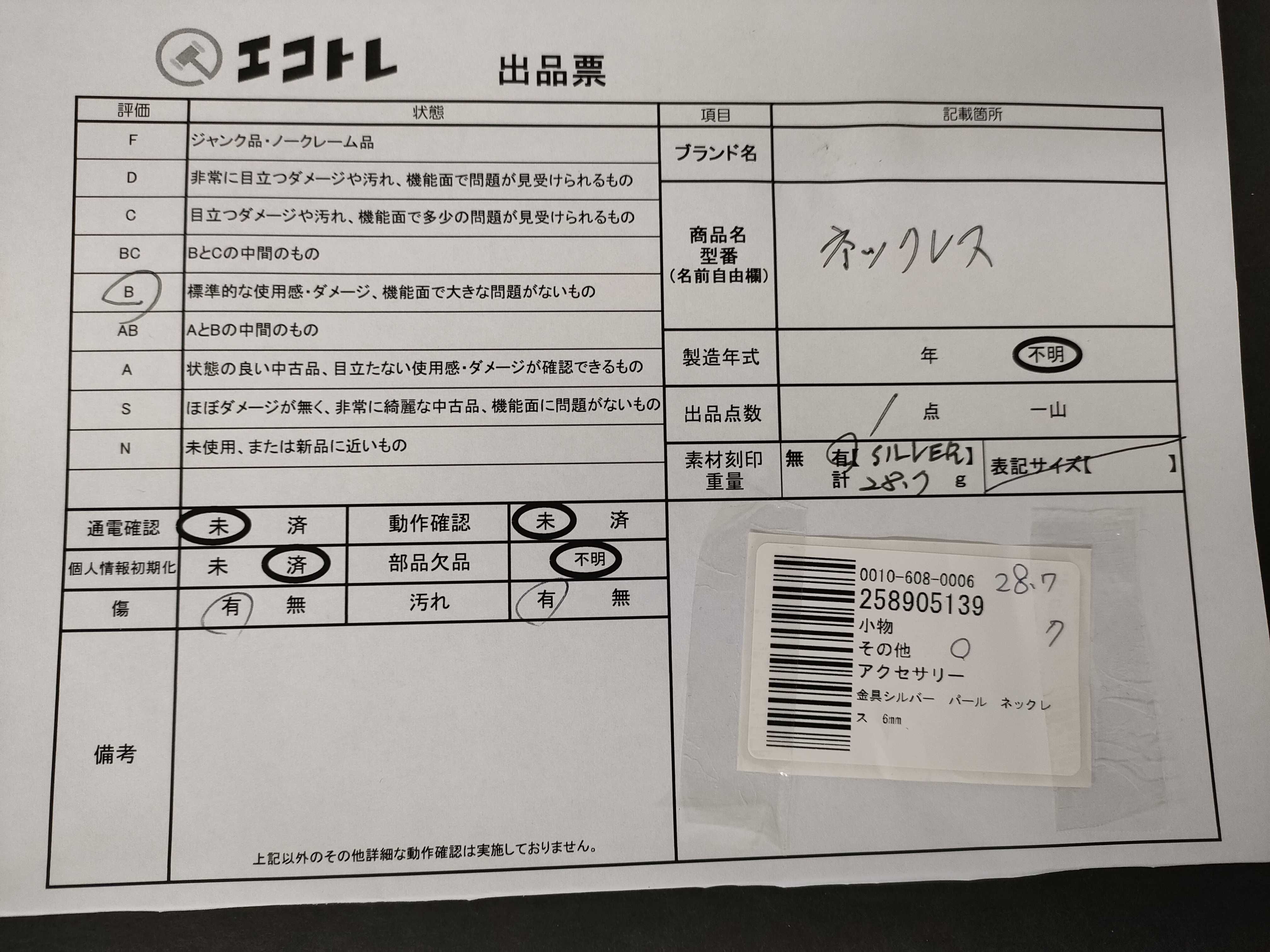 商品内容によって、JITBOXなどでの発送となる可能性がございます事ご理解下さい。年式などの商品情報詳細は写真にてご確認願います。※ご入札の際はご利用規約をよくお読みになってからのご参加お願いします。","タイプライン":"","カテゴリ":"アクセサリー","形状コード":"ネックレス","付属品コード":"","シリアル・シール・型番":""