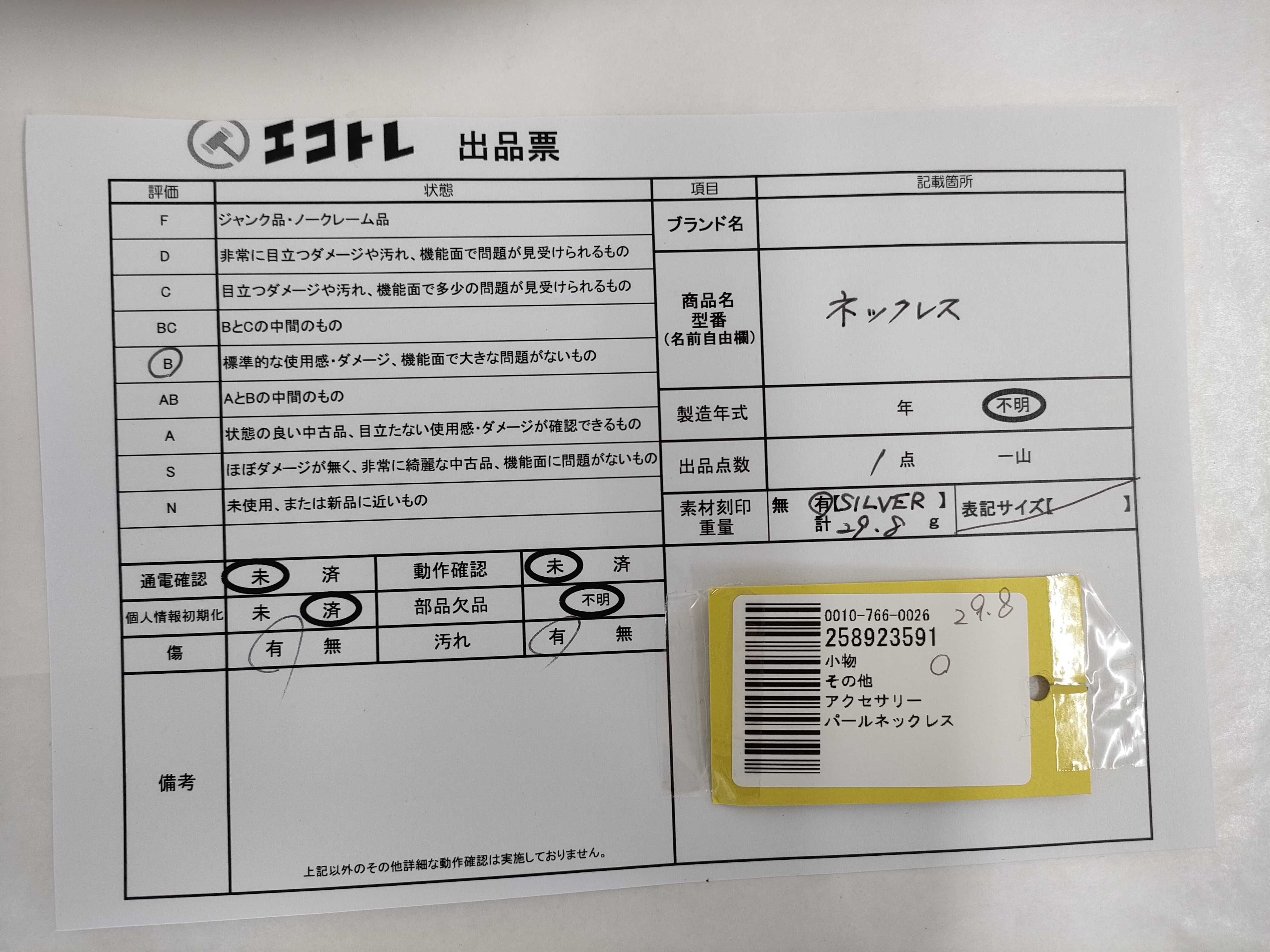 商品内容によって、JITBOXなどでの発送となる可能性がございます事ご理解下さい。年式などの商品情報詳細は写真にてご確認願います。※ご入札の際はご利用規約をよくお読みになってからのご参加お願いします。","タイプライン":"","カテゴリ":"アクセサリー","形状コード":"ネックレス","付属品コード":"","シリアル・シール・型番":""
