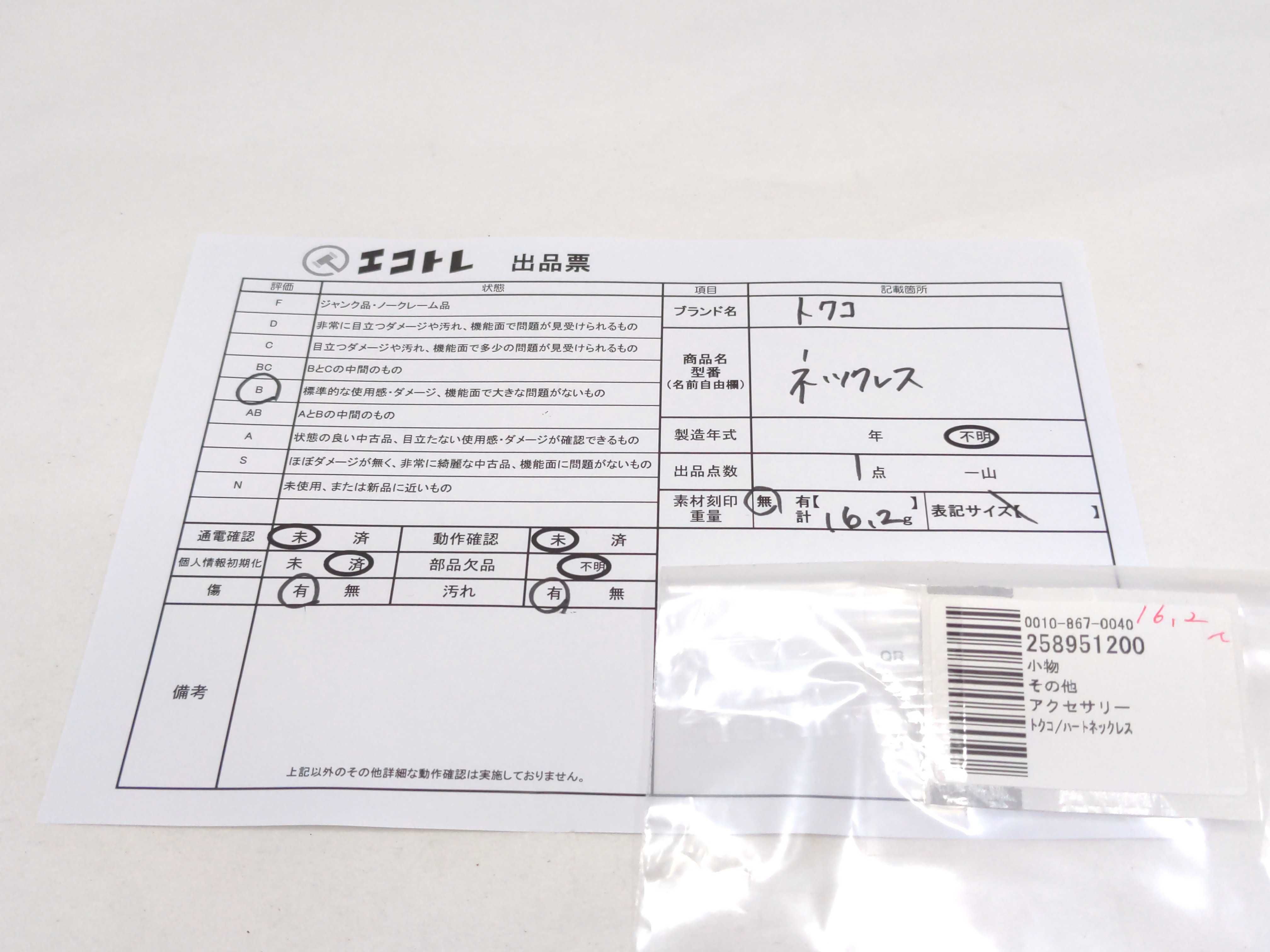 商品内容によって、JITBOXなどでの発送となる可能性がございます事ご理解下さい。年式などの商品情報詳細は写真にてご確認願います。※ご入札の際はご利用規約をよくお読みになってからのご参加お願いします。","タイプライン":"","カテゴリ":"アクセサリー","形状コード":"ネックレス","付属品コード":"","シリアル・シール・型番":""