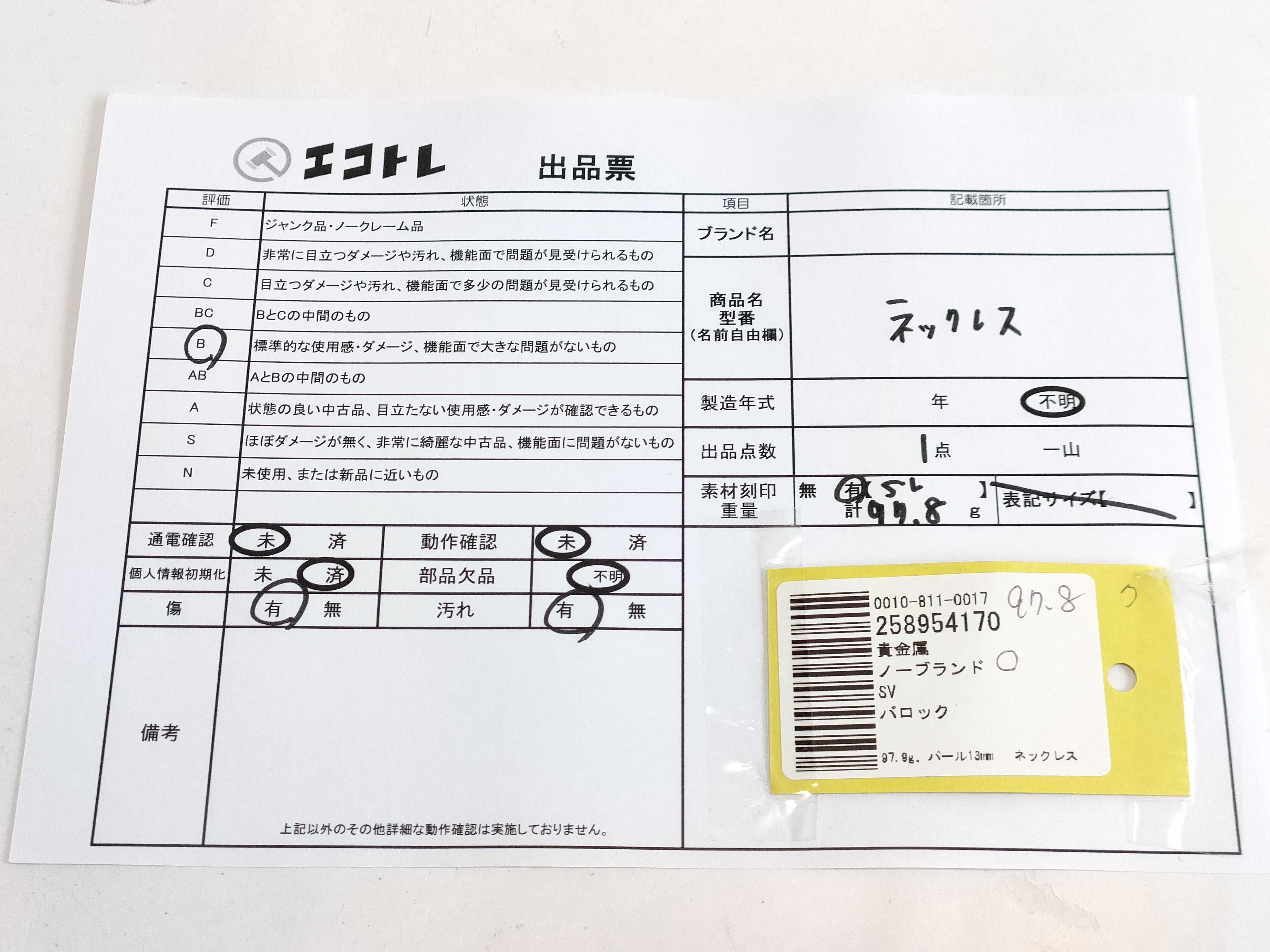 商品内容によって、JITBOXなどでの発送となる可能性がございます事ご理解下さい。年式などの商品情報詳細は写真にてご確認願います。※ご入札の際はご利用規約をよくお読みになってからのご参加お願いします。","タイプライン":"","カテゴリ":"アクセサリー","形状コード":"ネックレス","付属品コード":"","シリアル・シール・型番":""