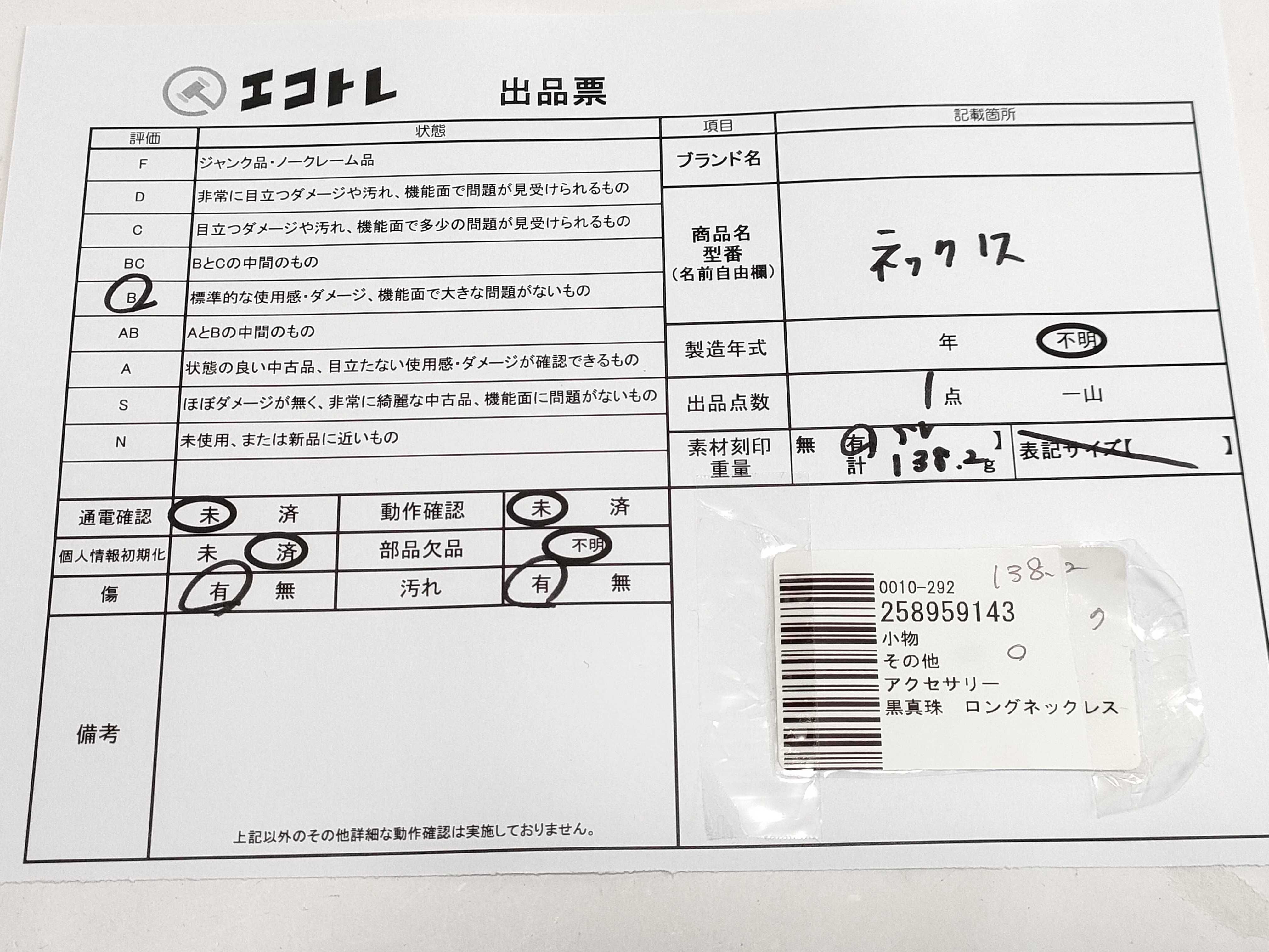 商品内容によって、JITBOXなどでの発送となる可能性がございます事ご理解下さい。年式などの商品情報詳細は写真にてご確認願います。※ご入札の際はご利用規約をよくお読みになってからのご参加お願いします。","タイプライン":"","カテゴリ":"アクセサリー","形状コード":"ネックレス","付属品コード":"","シリアル・シール・型番":""