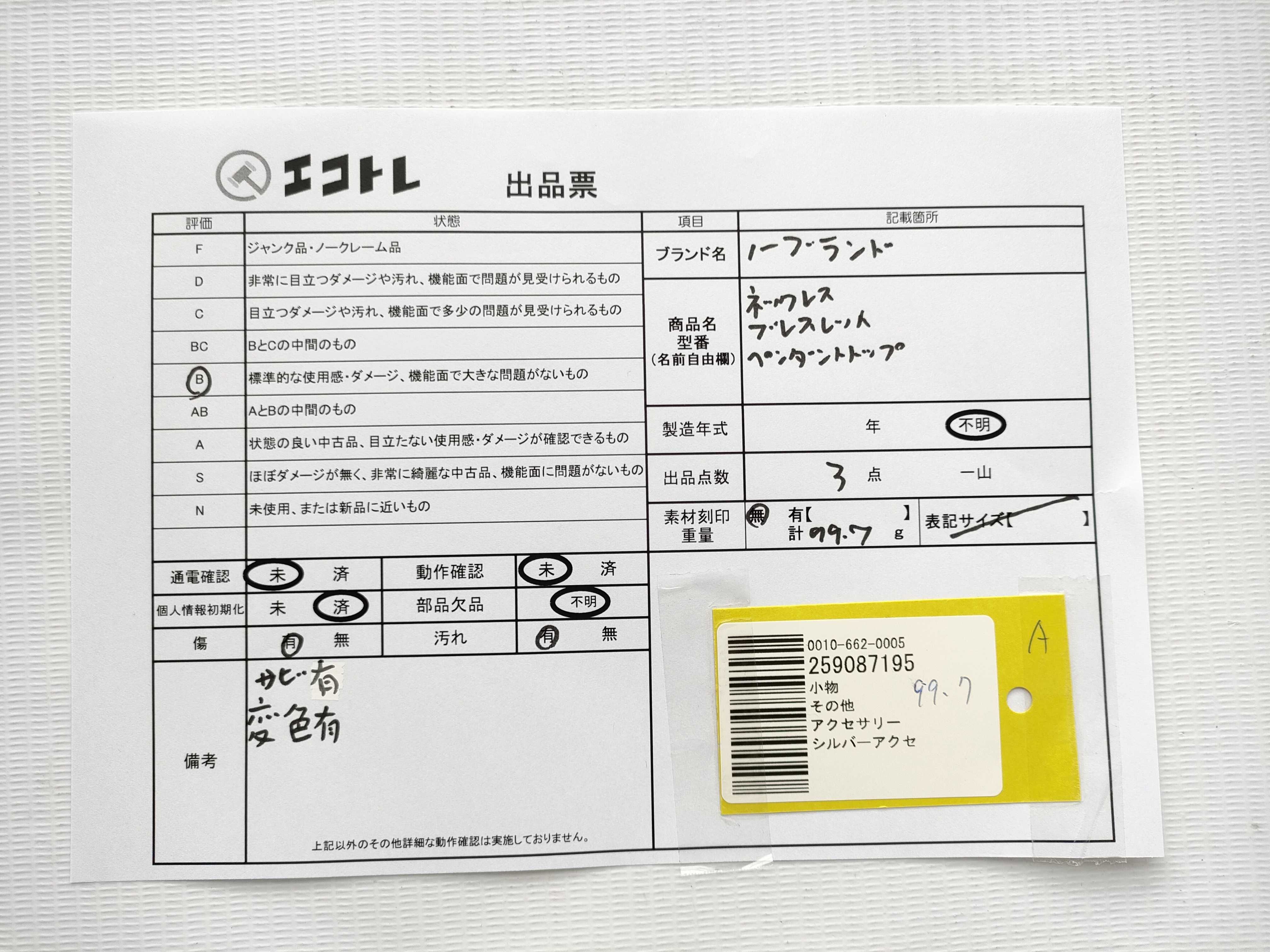 商品内容によって、JITBOXなどでの発送となる可能性がございます事ご理解下さい。年式などの商品情報詳細は写真にてご確認願います。※ご入札の際はご利用規約をよくお読みになってからのご参加お願いします。","タイプライン":"","カテゴリ":"アクセサリー","形状コード":"ネックレス","付属品コード":"","シリアル・シール・型番":""
