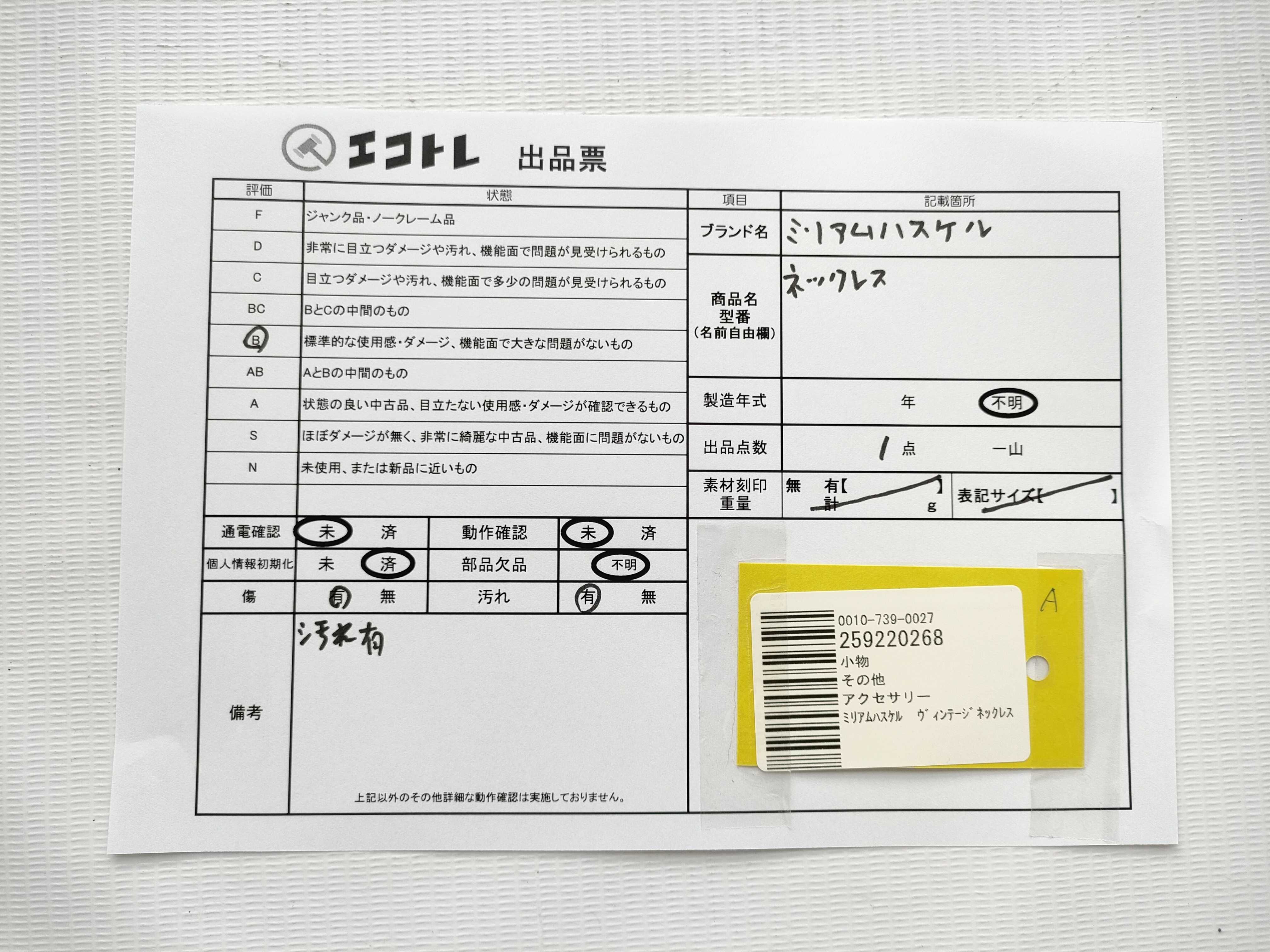 商品内容によって、JITBOXなどでの発送となる可能性がございます事ご理解下さい。年式などの商品情報詳細は写真にてご確認願います。※ご入札の際はご利用規約をよくお読みになってからのご参加お願いします。","タイプライン":"","カテゴリ":"アクセサリー","形状コード":"ネックレス","付属品コード":"","シリアル・シール・型番":""
