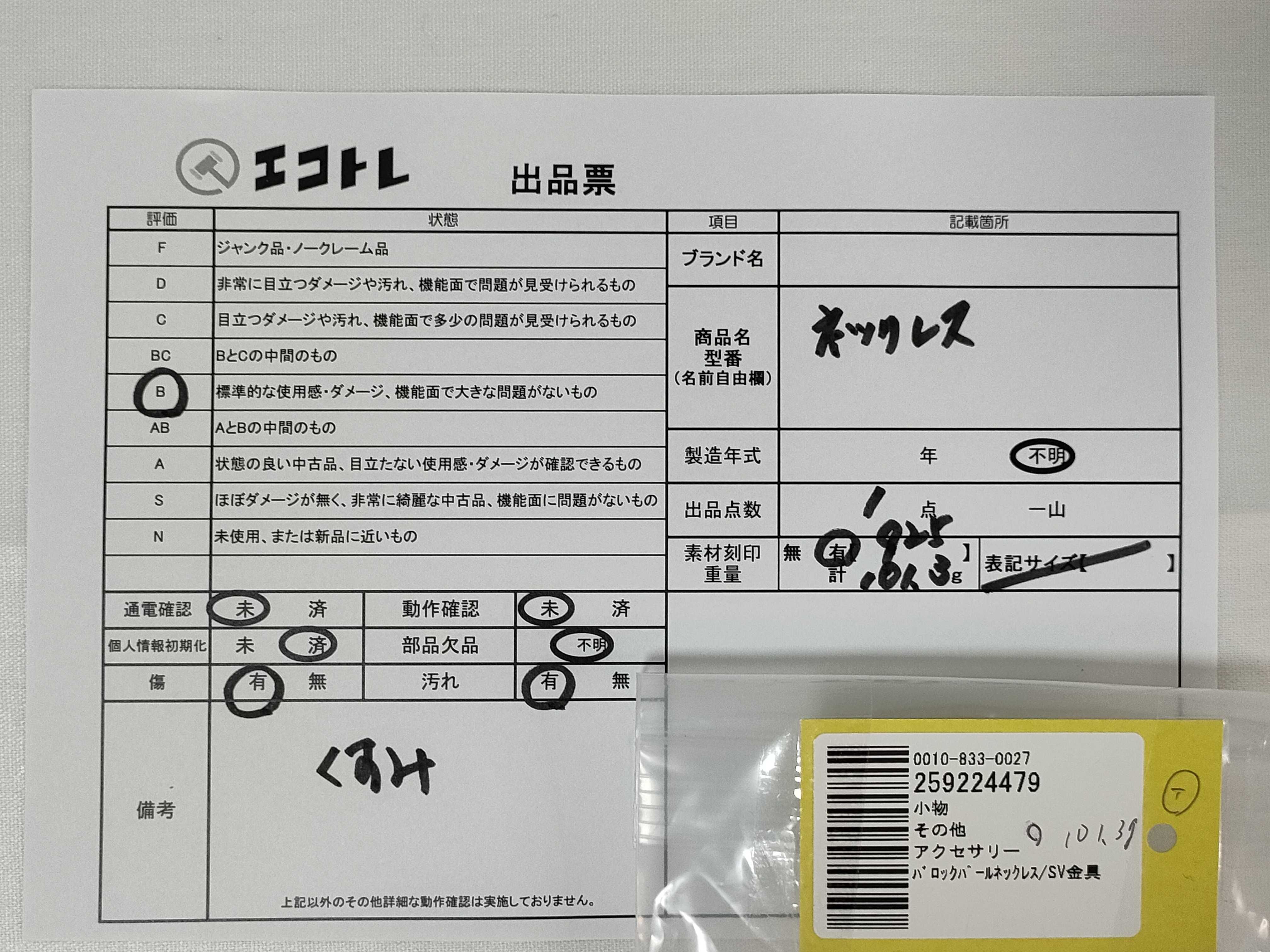 商品内容によって、JITBOXなどでの発送となる可能性がございます事ご理解下さい。年式などの商品情報詳細は写真にてご確認願います。※ご入札の際はご利用規約をよくお読みになってからのご参加お願いします。","タイプライン":"","カテゴリ":"アクセサリー","形状コード":"ネックレス","付属品コード":"","シリアル・シール・型番":""