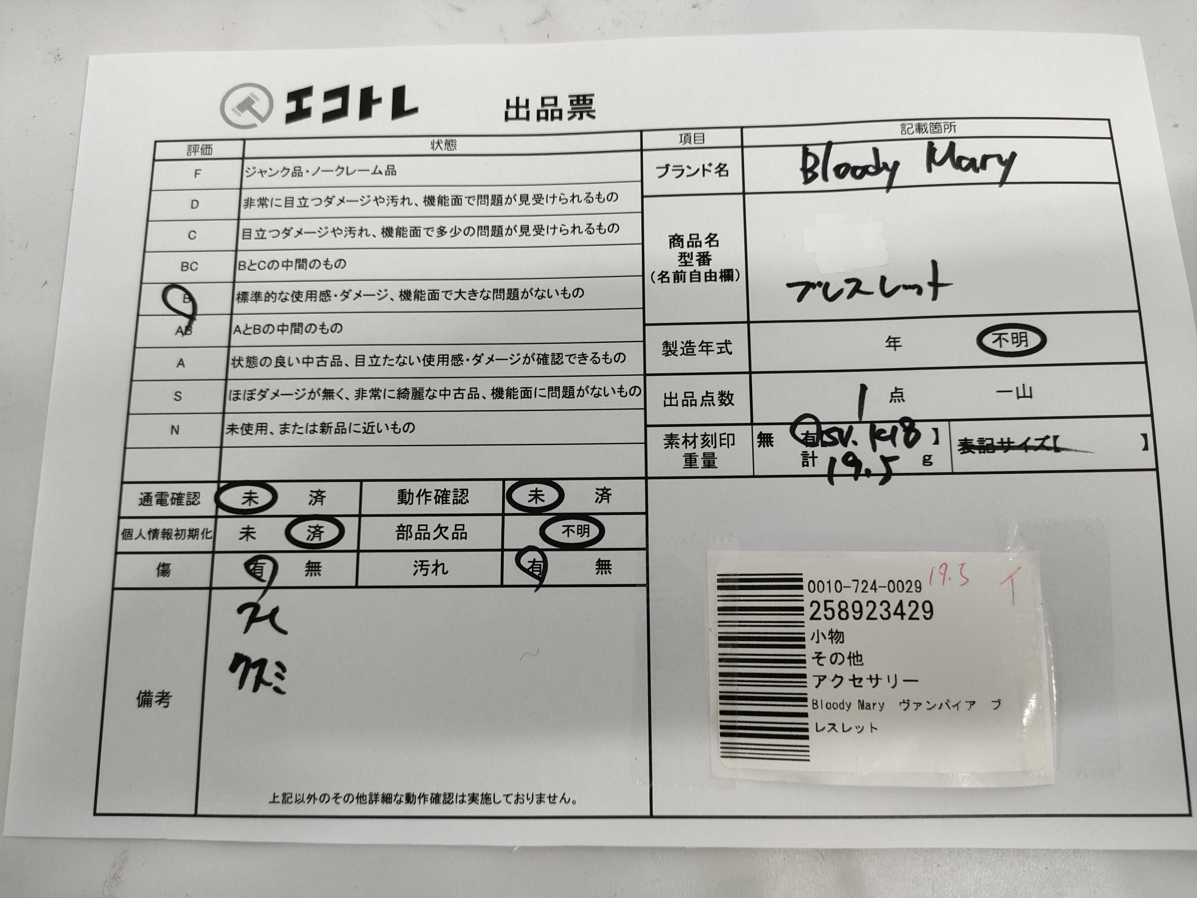 商品内容によって、JITBOXなどでの発送となる可能性がございます事ご理解下さい。年式などの商品情報詳細は写真にてご確認願います。※ご入札の際はご利用規約をよくお読みになってからのご参加お願いします。","タイプライン":"","カテゴリ":"アクセサリー","形状コード":"ブレスレット・バングル","付属品コード":"","シリアル・シール・型番":""