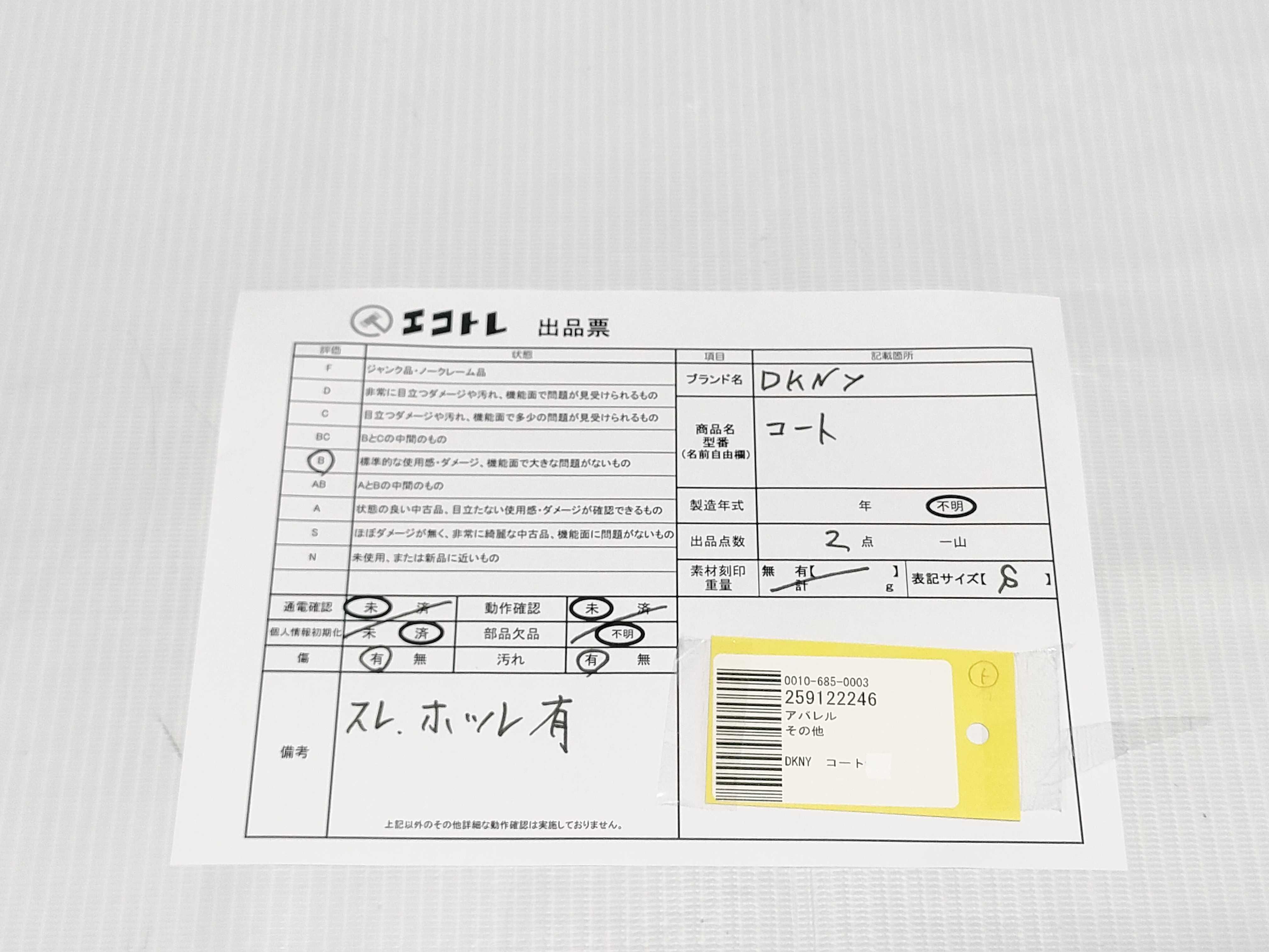 商品内容によって、JITBOXなどでの発送となる可能性がございます事ご理解下さい。年式などの商品情報詳細は写真にてご確認願います。※ご入札の際はご利用規約をよくお読みになってからのご参加お願いします。","タイプライン":"","カテゴリ":"アパレル","形状コード":"コート","付属品コード":"","シリアル・シール・型番":""